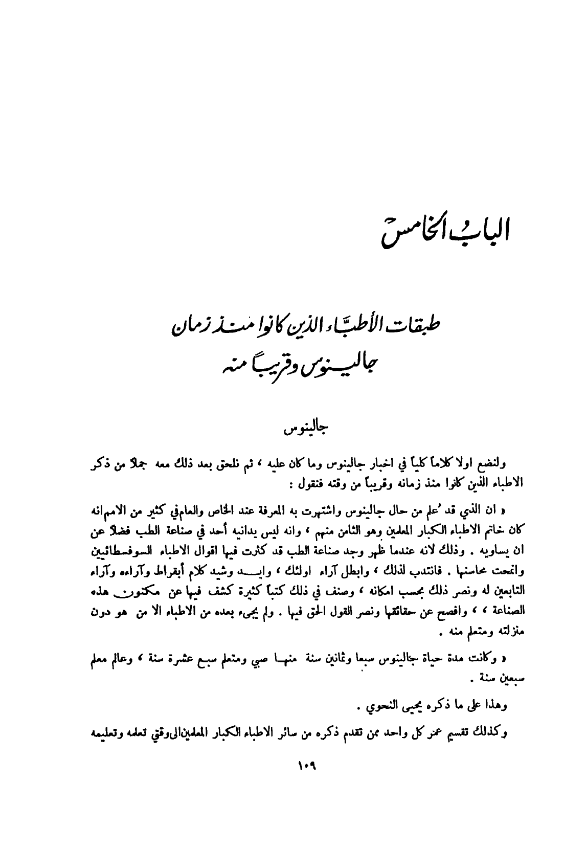 ولنضع أَولا كلَاما كليا فِي إِخْبَار جالينوس وَمَا كَانَ عَلَيْهِ ثمَّ نلحق بعد ذَلِك مَعَه جملا من ذكر الْأَطِبَّاء الَّذين كَانُوا مُنْذُ زَمَانه وقريبا من وقته فَنَقُول