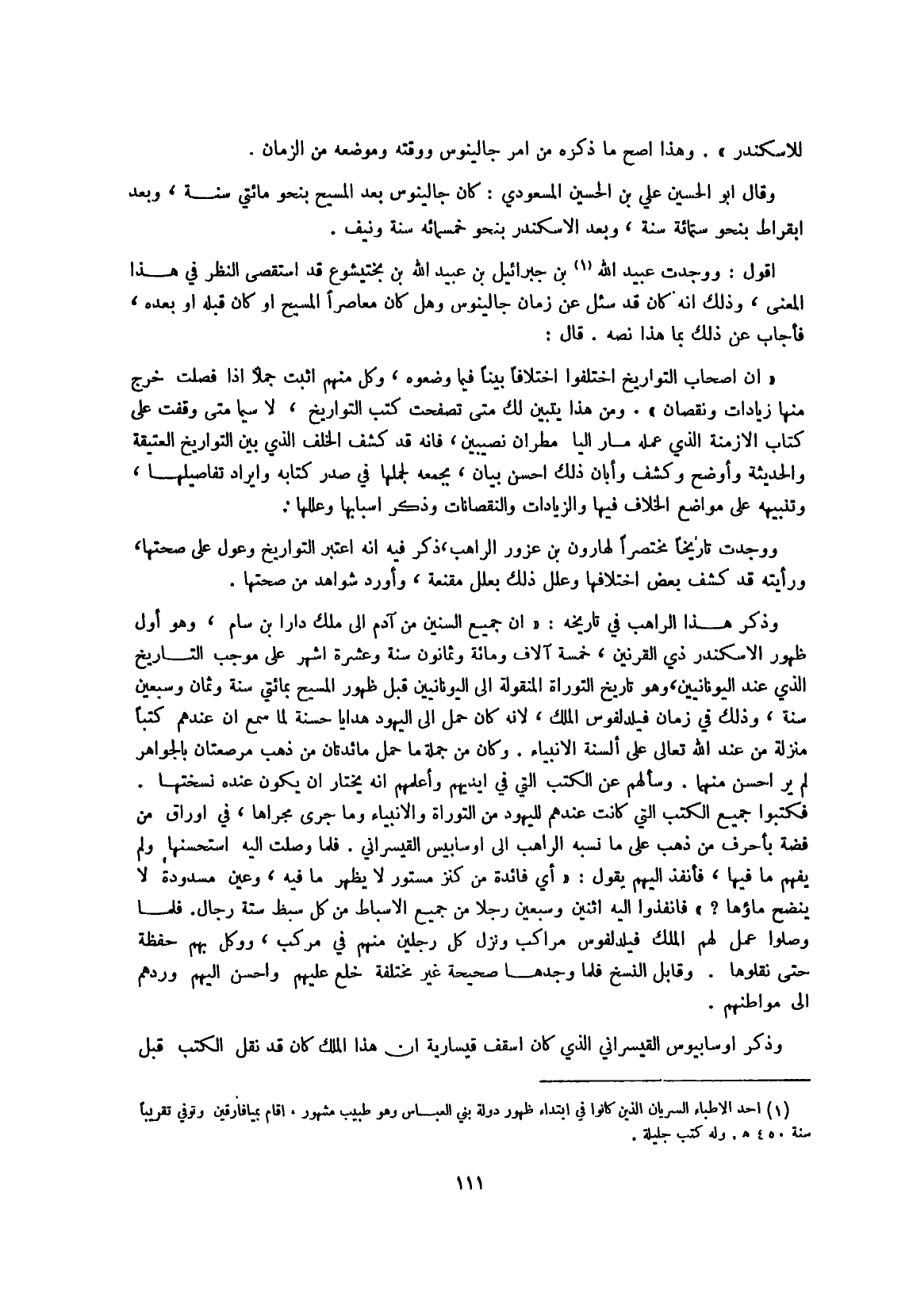 أَقُول وَوجدت عبيد الله بن جِبْرَائِيل بن عبيد الله بن بختيشوع قد استقصى النّظر فِي هَذَا الْمَعْنى وَذَلِكَ أَنه كَانَ قد سُئِلَ عَن زمَان جالينوس وَهل كَانَ معاصرا الْمَسِيح أَو كَانَ قبله أَو بعده فَأجَاب عَن ذَلِك بِمَا هَذَا نَصه