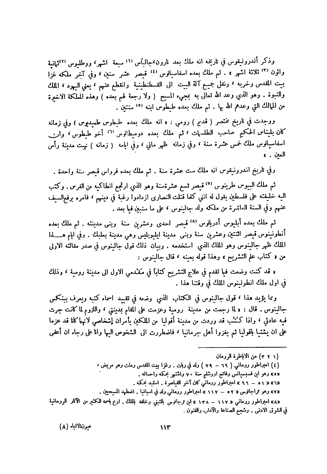 وَوجدت فِي تَارِيخ مُخْتَصر قديم رومي أَنه ملك بعده طيطوس طميديوس وَفِي زَمَانه كَانَ بليناس الْحَكِيم صَاحب الطلسمات ثمَّ ملك بعده دوميطانوس أَخُو طيطوس وَأَن أسفاسيانوس ملك خمس عشرَة سنة وَفِي زَمَانه ظهر ماني وَفِي أَيَّامه زَمَانه نهبت مَدِينَة رَأس الْعين