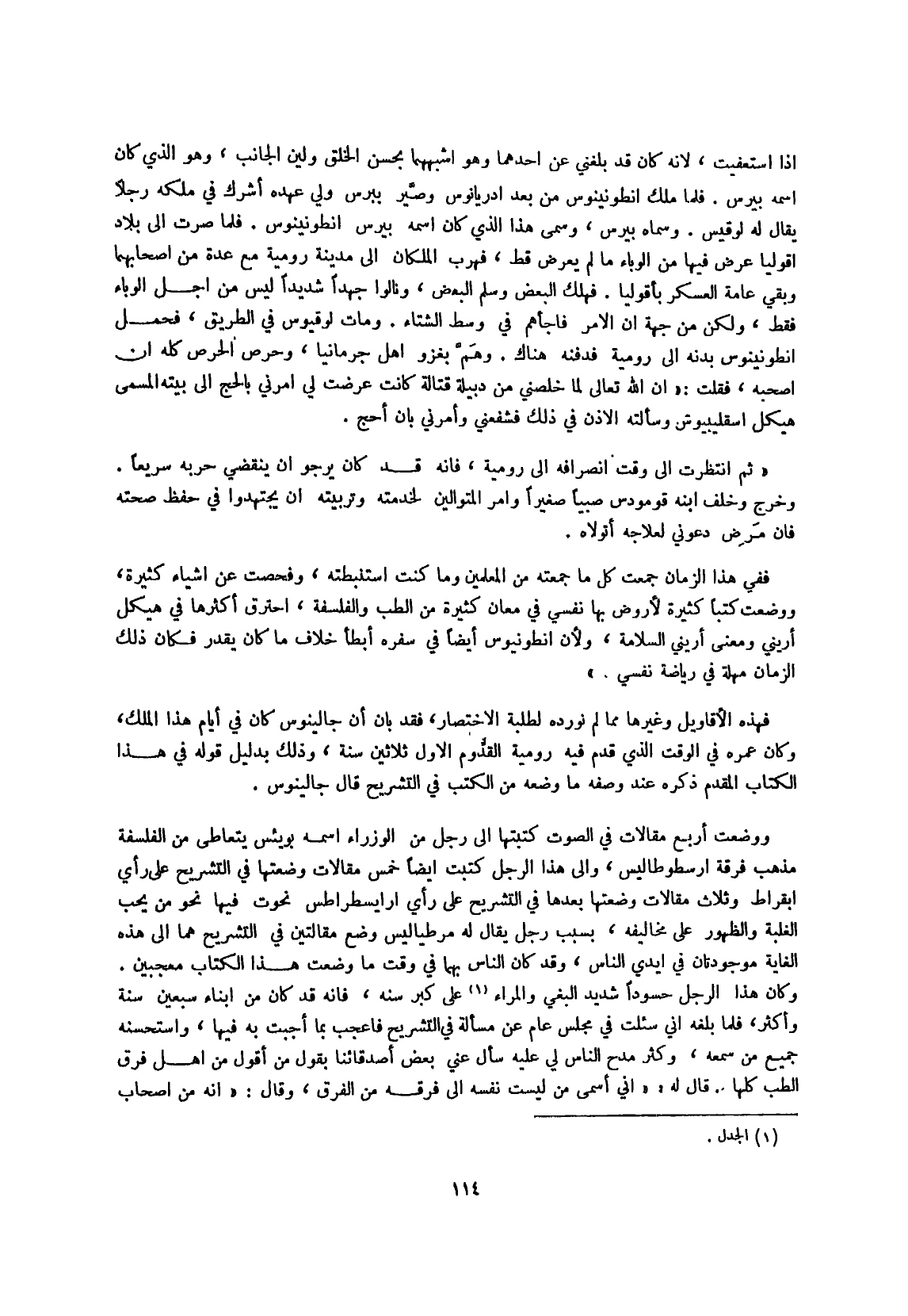 فَهَذِهِ الْأَقَاوِيل وَغَيرهَا مِمَّا لم نورده لطلبة الِاخْتِصَار فقد بَان أَن جالينوس كَانَ فِي أَيَّام هَذَا الْملك وَكَانَ عمره فِي الْوَقْت الَّذِي قدم فِيهِ رُومِية الْقدوم الأول ثَلَاثِينَ سنة وَذَلِكَ بِدَلِيل قَوْله فِي هَذَا الْكتاب الْمُقدم ذكره عِنْد وَصفه مَا وَضعه من الْكتب فِي التشريح قَالَ جالينوس