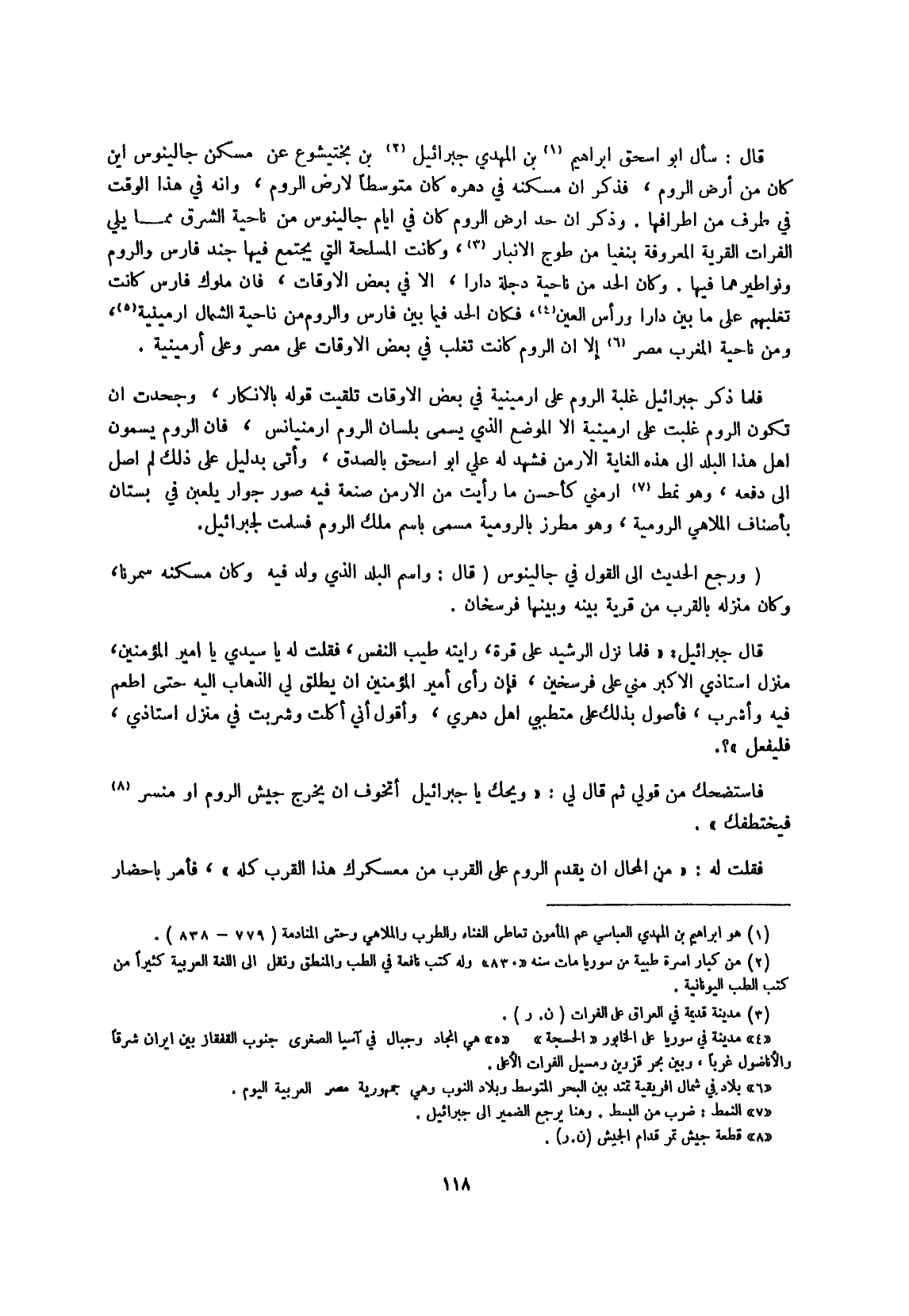 قَالَ سَأَلَ أَبُو إِسْحَق إِبْرَاهِيم بن الْمهْدي جِبْرَائِيل بن بختيشوع عَن مسكن جالينوس أَيْن كَانَ من أَرض الرّوم فَذكر أَن مَسْكَنه فِي دهره كَانَ متوسطا لأرض الرّوم وَأَنه فِي هَذَا الْوَقْت فِي طرف من أطرافها