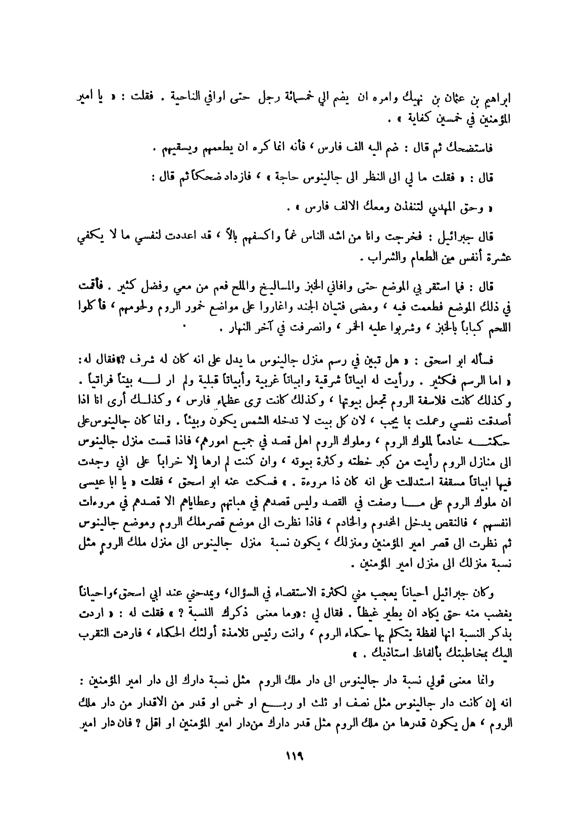فَسكت عَنهُ أَبُو إِسْحَق فَقلت يَا أَبَا عِيسَى إِن مُلُوك الرّوم على مَا وصفت فِي الْقَصْد وَلَيْسَ قصدهم فِي هباتهم وعطاياهم إِلَّا قصدهم فِي مروءات أنفسهم فالنقص يدْخل المخدوم وَالْخَادِم فَإِذا نظرت إِلَى مَوضِع قصر ملك الرّوم وَمَوْضِع جالينوس ثمَّ نظرت إِلَى قصر أَمِير الْمُؤمنِينَ ومنزلك يكون نِسْبَة منزل جالينوس إِلَى منزل ملك الرّوم مثل نِسْبَة مَنْزِلك إِلَى منزل أَمِير الْمُؤمنِينَ