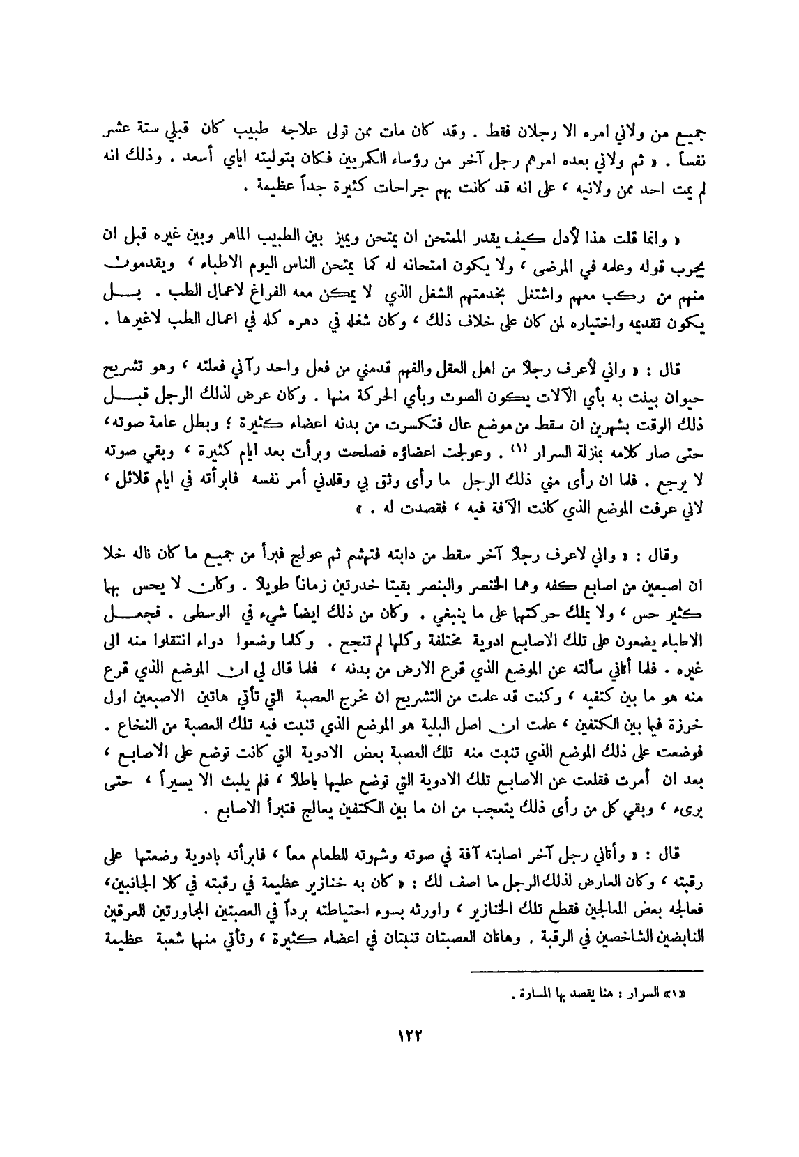 فَلَمَّا أَتَانِي سَأَلته عَن الْموضع الَّذِي قرع الأَرْض من بدنه فَلَمَّا قَالَ لي أَن الْموضع الَّذِي قرع مِنْهُ هُوَ مَا بَين كَتفيهِ وَكنت قد علمت من التشريح أَن مخرج الْعصبَة الَّتِي تَأتي هَاتين الأصبعين أول خرزة فِيمَا بَين الْكَتِفَيْنِ علمت أَن أصل البلية هُوَ الْموضع الَّذِي تنْبت فِيهِ تِلْكَ الْعصبَة من النخاع