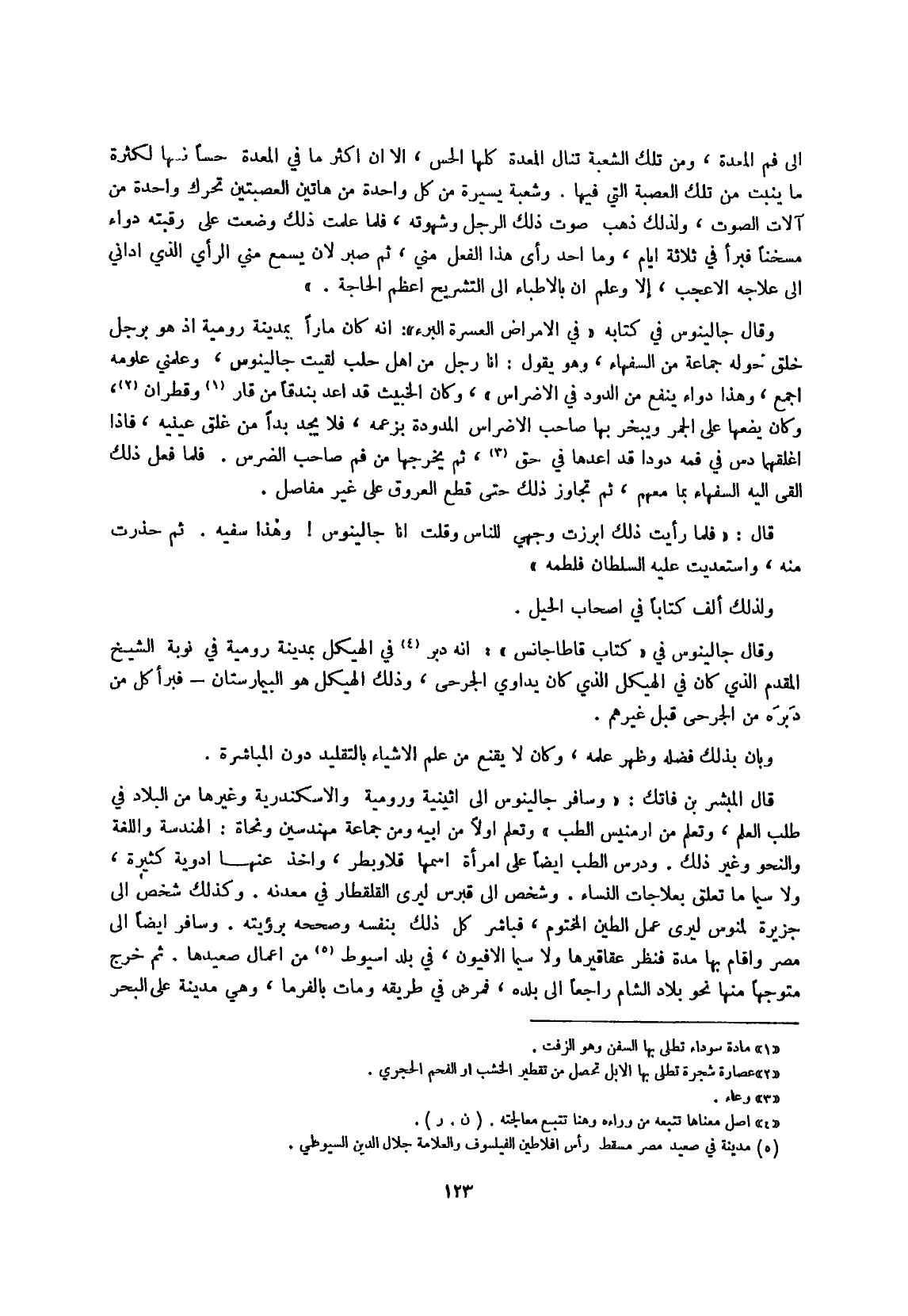 وَشعْبَة يسيرَة من كل وَاحِدَة من هَاتين العصبتين تحرّك وَاحِدَة من آلَات الصَّوْت وَلذَلِك ذهب صَوت ذَلِك الرجل وشهوته فَلَمَّا علمت ذَلِك وضعت على رقبته دَوَاء مسخنا فبرأ فِي ثَلَاثَة أَيَّام وَمَا أحد رأى هَذَا الْفِعْل مني ثمَّ صَبر لِأَن يسمع مني الرَّأْي الَّذِي أداني إِلَى علاجه الأعجب إِلَّا وَعلم أَن بالأطباء إِلَى التشريح أعظم الْحَاجة