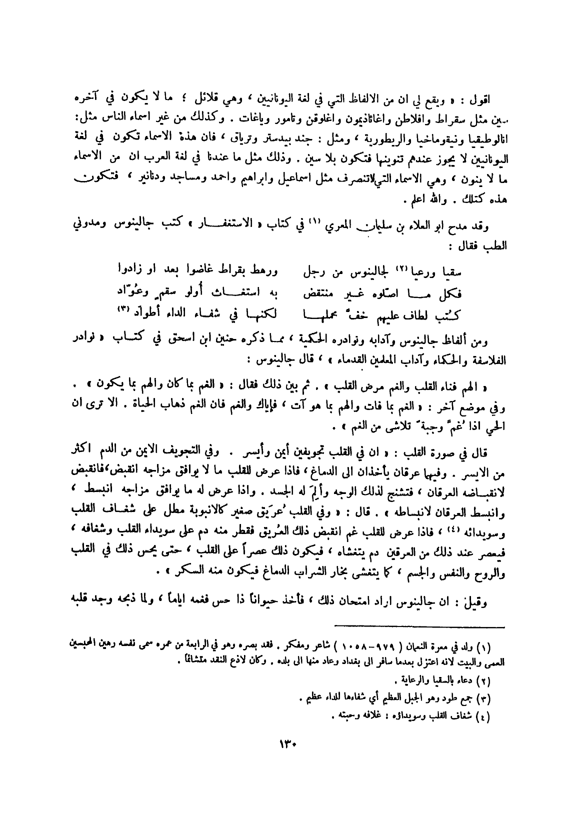 وَقد مدح أَبُو الْعَلَاء بن سُلَيْمَان المعري فِي كتاب الاسْتِغْفَار كتب جالينوس ومدوني الطِّبّ فَقَالَ