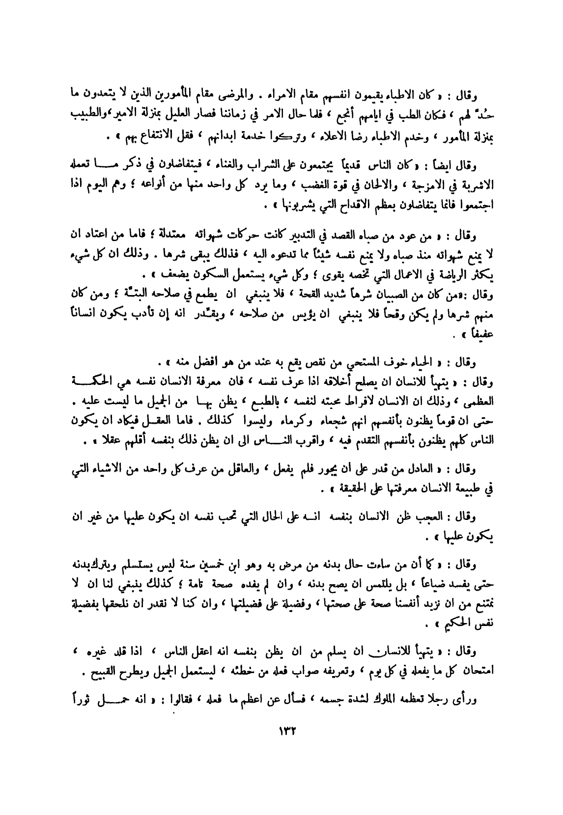 وَقَالَ كَمَا أَن من ساءت حَال بدنه من مرض بِهِ وَهُوَ ابْن خمسين سنة لَيْسَ يستسلم وَيتْرك بدنه حَتَّى يفْسد ضيَاعًا بل يلْتَمس أَن يَصح بدنه وَإِن لم يفده صِحَة تَامَّة كَذَلِك يَنْبَغِي لنا أَن لَا نمتنع من أَن نزيد أَنْفُسنَا صِحَة على صِحَّتهَا وفضيلة على فضيلتها وَإِن كُنَّا لَا نقدر أَن نلحقها بفضيلة نفس الْحَكِيم