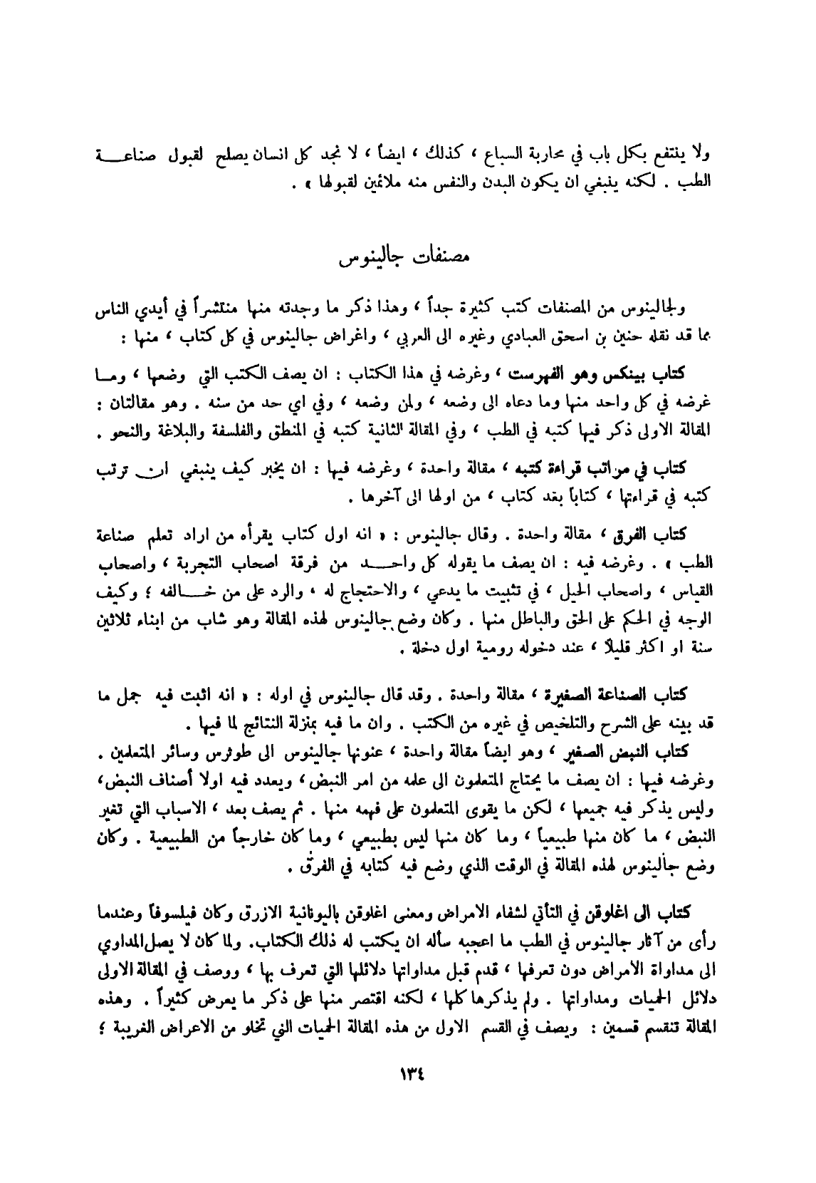 ولجالينوس من المصنفات كتب كَثِيرَة جدا وَهَذَا ذكر مَا وجدته مِنْهَا منتشرا فِي أَيدي النَّاس مِمَّا قد نَقله حنين بن إِسْحَق الْعَبَّادِيّ وَغَيره إِلَى الْعَرَبِيّ وأغراض جالينوس فِي كل كتاب مِنْهَا