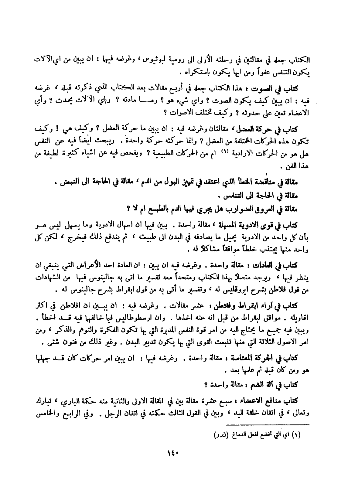 كتاب فِي الصَّوْت هَذَا الْكتاب جعله فِي أَربع مقالات بعد الْكتاب الَّذِي ذكرته قبله غَرَضه فِيهِ أَن يبين كَيفَ يكون الصَّوْت وَأي شَيْء هُوَ وَمَا مادته وَبِأَيِّ الْآلَات يحدث وَأي الْأَعْضَاء تعين على حُدُوثه وَكَيف تخْتَلف الْأَصْوَات