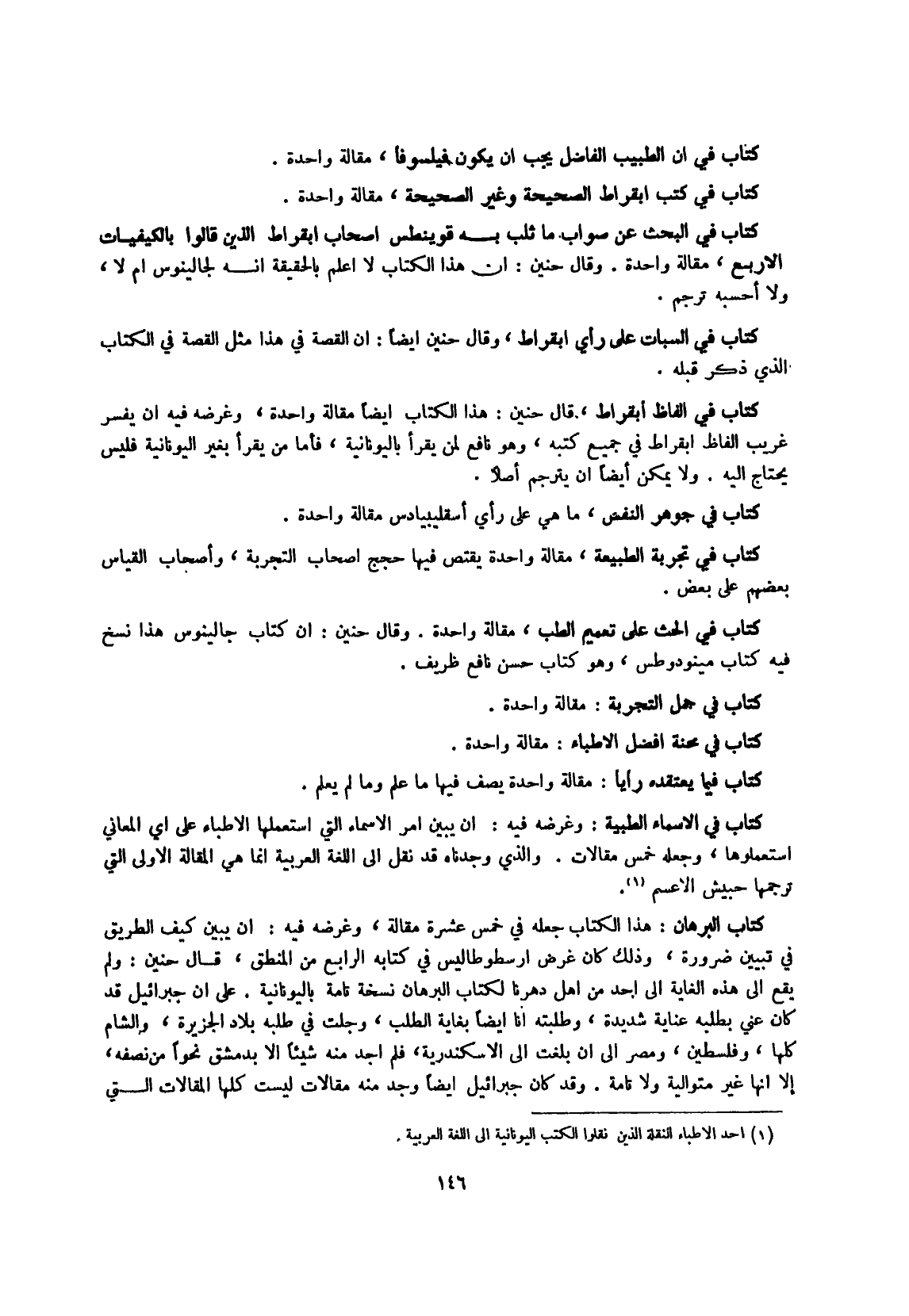 كتاب الْبُرْهَان هَذَا الْكتاب جعله فِي خمس عشرَة مقَالَة وغرضه فِيهِ أَن يبين كَيفَ الطَّرِيق فِي تَبْيِين ضَرُورَة وَذَلِكَ كَانَ غَرَض أرسطوطاليس فِي كِتَابه الرَّابِع من الْمنطق قَالَ حنين وَلم يَقع إِلَى هَذِه الْغَايَة إِلَى أحد من أهل دَهْرنَا لكتاب الْبُرْهَان نُسْخَة تَامَّة باليونانية