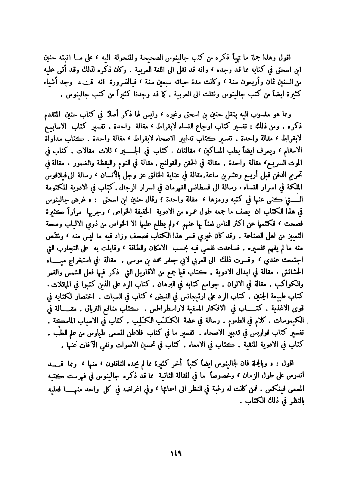 أَقُول وَهَذَا جملَة مَا تهَيَّأ ذكره من كتب جالينوس الصَّحِيحَة والمنحولة إِلَيْهِ على مَا أثْبته حنين ابْن إِسْحَق فِي كِتَابه مِمَّا قد وجده وَأَنه قد نقل إِلَى اللُّغَة الْعَرَبيَّة