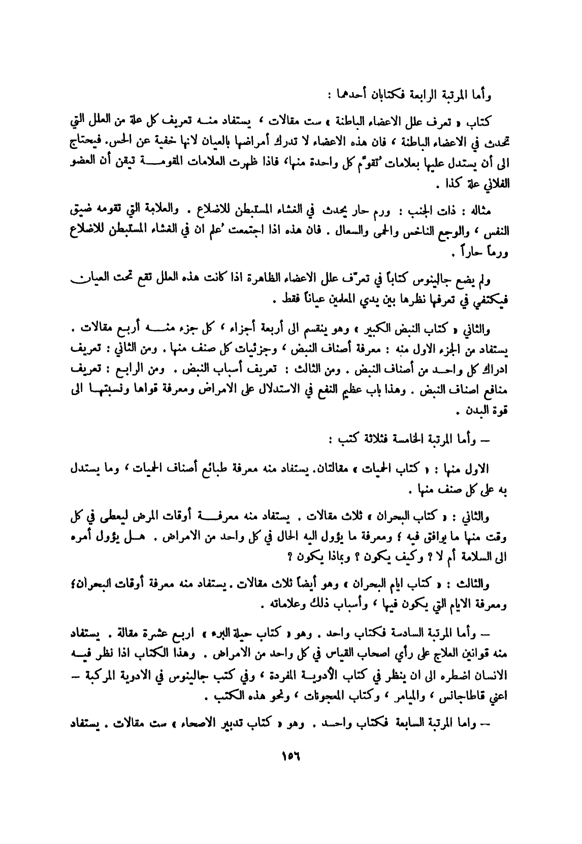 وَهَذَا الْكتاب إِذا نظر فِيهِ الْإِنْسَان اضطره إِلَى أَن ينظر فِي كتاب الْأَدْوِيَة المفردة وَفِي كتب جالينوس فِي الْأَدْوِيَة المركبة أَعنِي قاطاجانس والميامر وَكتاب المعجونات وَنَحْو هَذِه الْكتب