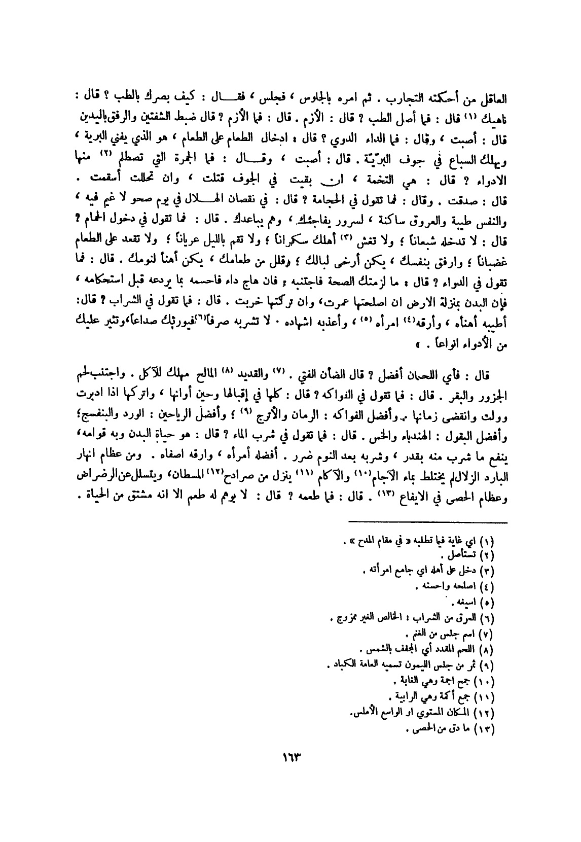 ثمَّ أمره بِالْجُلُوسِ فَجَلَسَ فَقَالَ كَيفَ بَصرك بالطب قَالَ ناهيك قَالَ فَمَا أصل الطِّبّ قَالَ الأزم