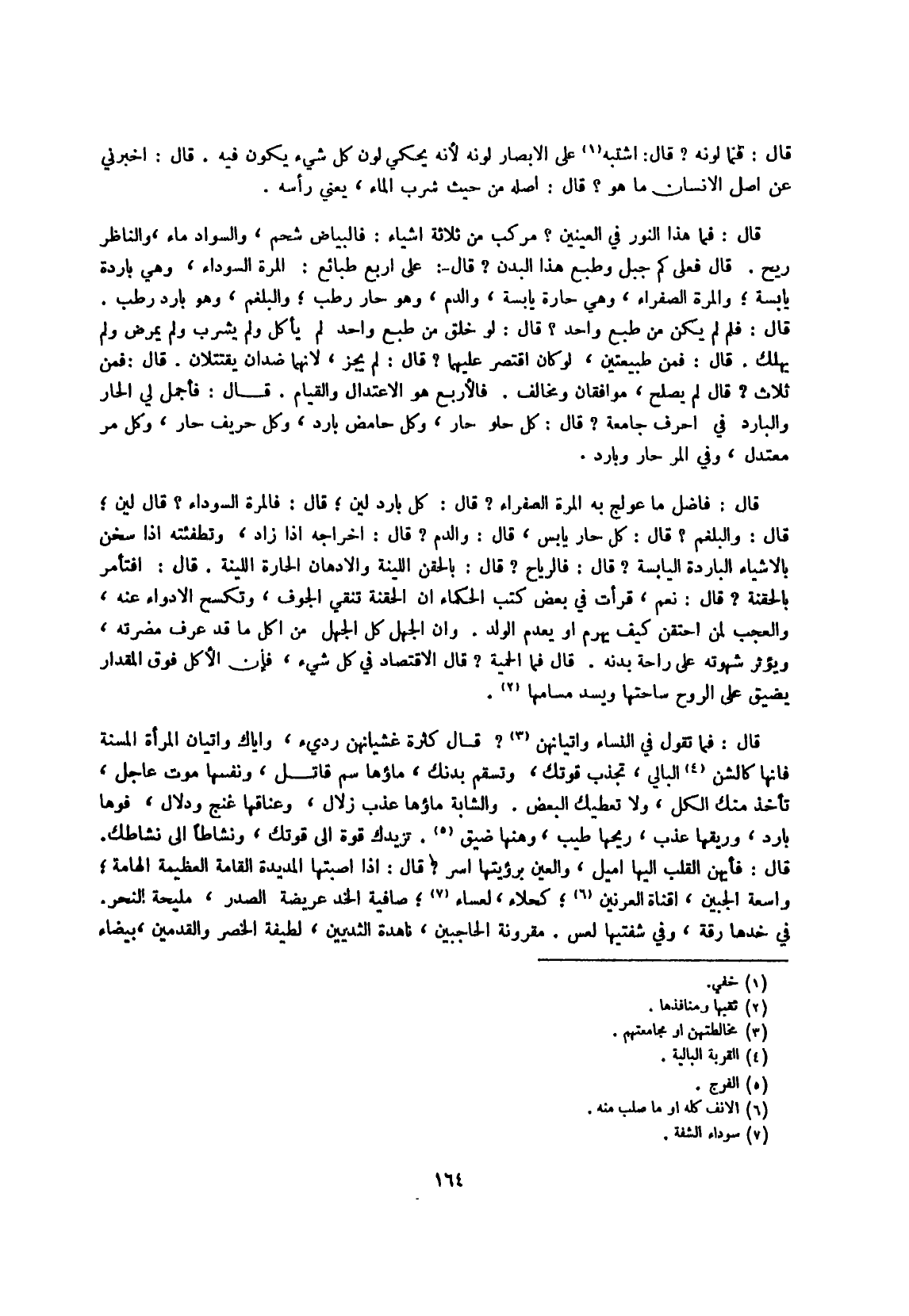 قَالَ فَاضل مَا عولج بِهِ الْمرة الصَّفْرَاء قَالَ كل بَارِد لين قَالَ فالمرة السَّوْدَاء قَالَ لين قَالَ والبلغم قَالَ كل حَار يَابِس قَالَ وَالدَّم قَالَ إِخْرَاجه إِذا زَاد وتطفئته إِذا سخن بالأشياء الْبَارِدَة الْيَابِسَة قَالَ فالرياح قَالَ بالحقن اللينة والأدهان الحارة اللينة