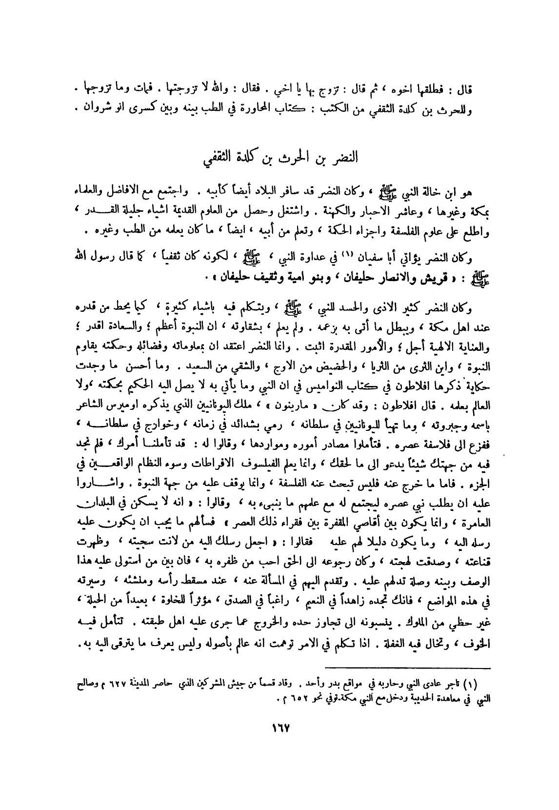 وَإِنَّمَا النَّضر اعْتقد أَن بمعلوماته وفضائله وحكمته يُقَاوم النُّبُوَّة وَأَيْنَ الثرى من الثريا والحضيض من الأوج والشقي من السعيد