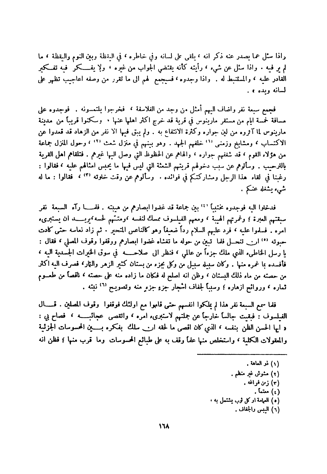 فَلَمَّا رَآهُ السَّبْعَة نفر سبقتهم الْعبْرَة وغمرتهم الهيبة وَمَعَهُمْ الفيلسوف مُمْسك لنَفسِهِ ومتهم لحسه يُرِيد أَن يستبرئ أمره