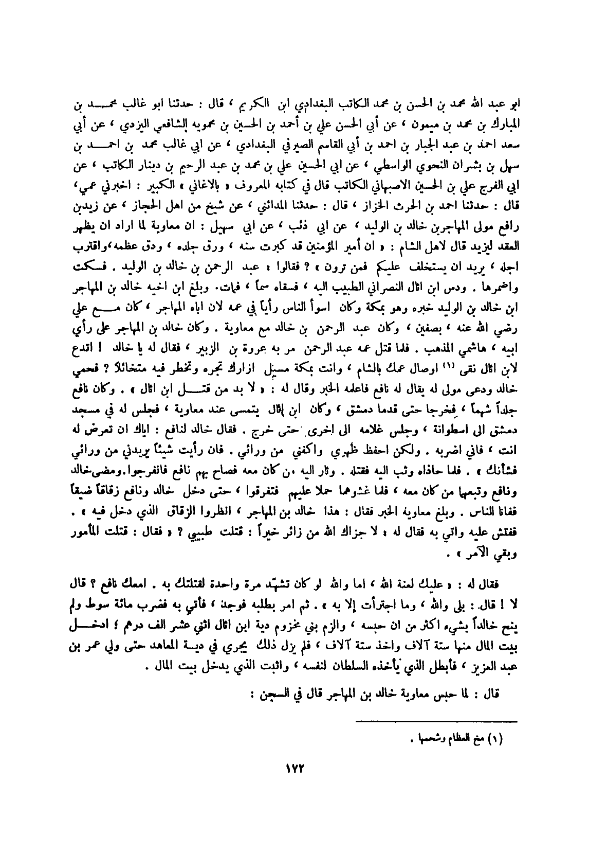 أَبُو عبد الله مُحَمَّد بن الْحسن بن مُحَمَّد الْكَاتِب الْبَغْدَادِيّ ابْن الْكَرِيم قَالَ حَدثنَا أَبُو غَالب مُحَمَّد بن الْمُبَارك بن مُحَمَّد بن مَيْمُون عَن أبي الْحسن عَليّ بن أَحْمد بن الْحُسَيْن بن محمويه الشَّافِعِي اليزدي عَن أبي سعد أَحْمد بن عبد الْجَبَّار بن أَحْمد بن أبي الْقَاسِم الصَّيْرَفِي الْبَغْدَادِيّ عَن أبي غَالب مُحَمَّد بن أَحْمد بن سهل بن بَشرَان النَّحْوِيّ الوَاسِطِيّ عَن أبي الْحُسَيْن عَليّ بن مُحَمَّد بن عبد الرَّحِيم بن دِينَار الْكَاتِب عَن أبي الْفرج عَليّ بن الْحُسَيْن الْأَصْبَهَانِيّ الْكَاتِب قَالَ فِي كِتَابه الْمَعْرُوف بالأغاني الْكَبِير أَخْبرنِي عمي قَالَ حَدثنَا أَحْمد بن الْحَرْث الخزاز قَالَ حَدثنَا الْمَدَائِنِي عَن شيخ أهل الْحجاز عَن زيد بن رَافع مولى الْمُهَاجِرين خَالِد بن الْوَلِيد عَن أبي ذِئْب عَن أبي سُهَيْل أَن مُعَاوِيَة لما أَرَادَ أَن يظْهر العقد ليزِيد قَالَ لأهل الشَّام إِن أَمِير الْمُؤمنِينَ قد كَبرت سنه ورق جلده ودق عظمه واقترب أَجله يُرِيد أَن يسْتَخْلف عَلَيْكُم فَمن ترَوْنَ فَقَالُوا عبد الرَّحْمَن بن خَالِد بن الْوَلِيد