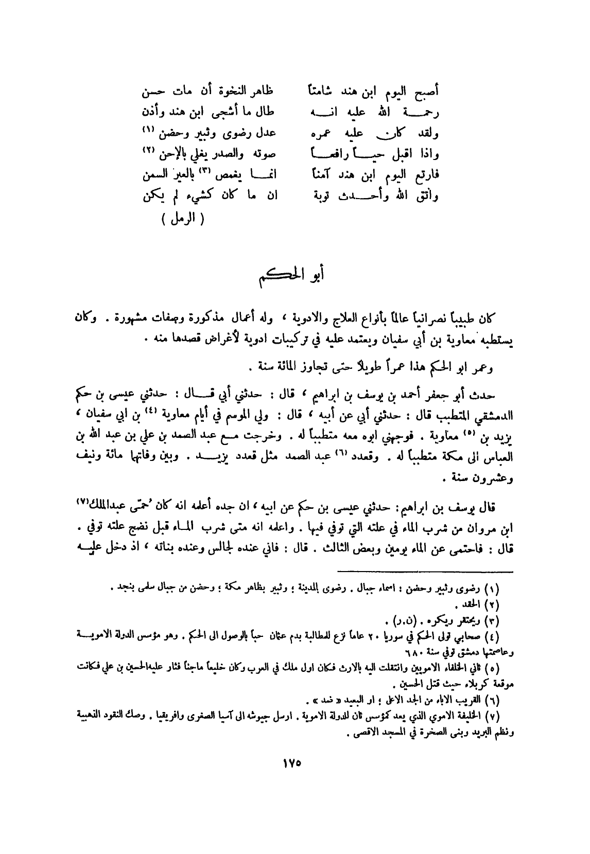 حدث أَبُو جَعْفَر أَحْمد بن يُوسُف بن إِبْرَاهِيم قَالَ حَدثنِي أبي قَالَ حَدثنِي عِيسَى بن حكم الدِّمَشْقِي المتطبب قَالَ حَدثنِي أبي عَن أَبِيه قَالَ ولي الْمَوْسِم فِي أَيَّام مُعَاوِيَة بن أبي سُفْيَان يزِيد بن مُعَاوِيَة