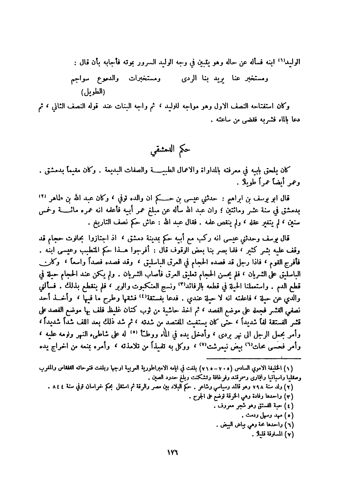 قَالَ يُوسُف وحَدثني عِيسَى أَنه ركب مَعَ أَبِيه حكم بِمَدِينَة دمشق إِذْ اجتازوا بحانوت حجام قد وقف عَلَيْهِ بشر كثير فَلَمَّا بصر بِنَا بعض الْوُقُوف قَالَ أفرجوا هَذَا حكم المتطبب وَعِيسَى ابْنه