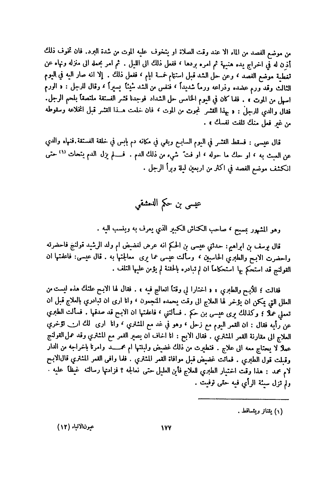 قَالَ يُوسُف بن إِبْرَاهِيم حَدثنِي عِيسَى بن الحكم أَنه عرض لغضيض أم ولد الرشيد قولنج فاحضرته وأحضرت الْأَبَح والطبري الحاسبين وَسَأَلت عِيسَى عَمَّا يرى معالجتها بِهِ