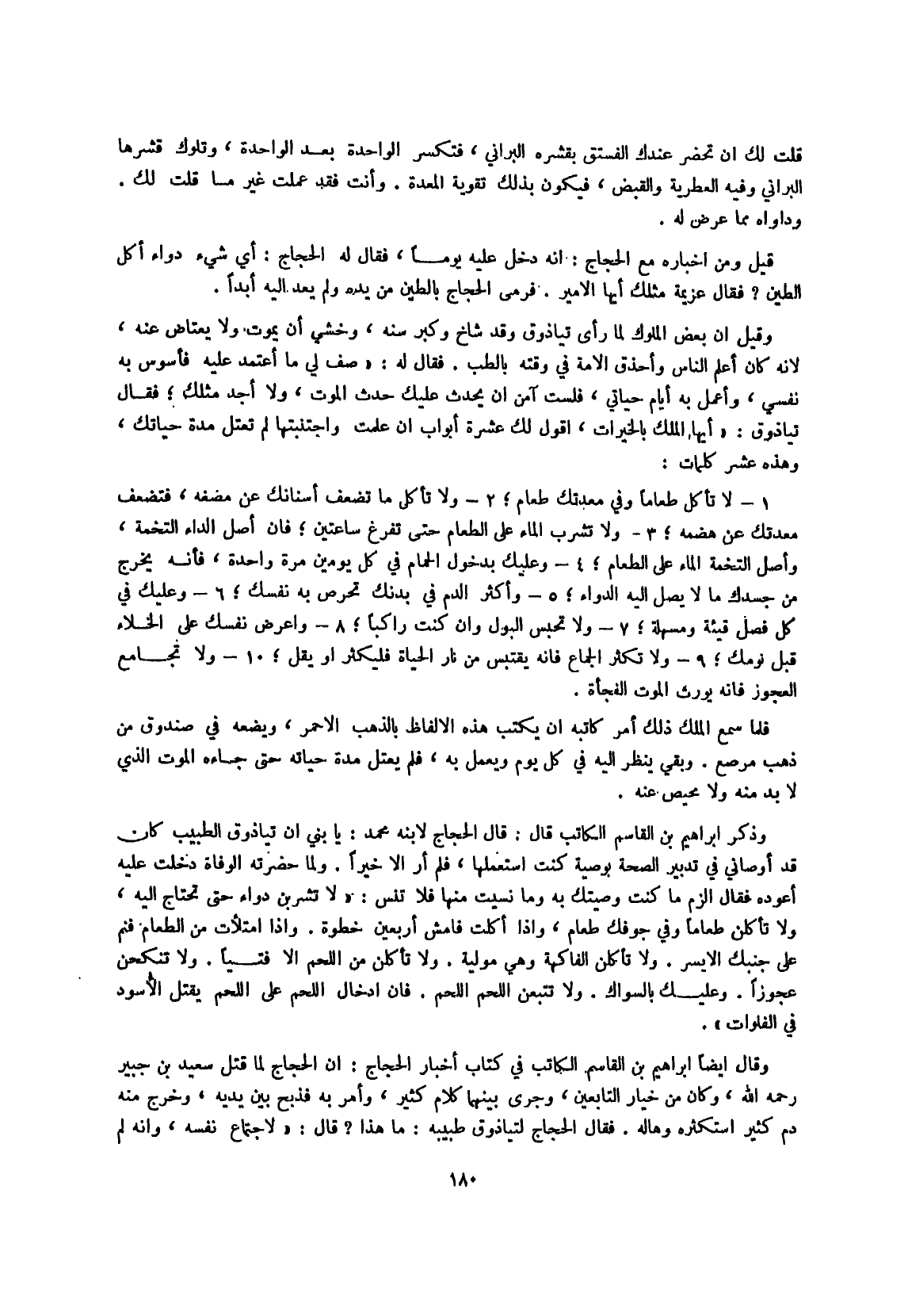 وَذكر إِبْرَاهِيم بن الْقَاسِم الْكَاتِب قَالَ قَالَ الْحجَّاج لِابْنِهِ مُحَمَّد يَا بني إِن تياذوق الطَّبِيب كَانَ قد أَوْصَانِي فِي تَدْبِير الصِّحَّة بِوَصِيَّة كنت استعملها فَلم أر إِلَّا خيرا