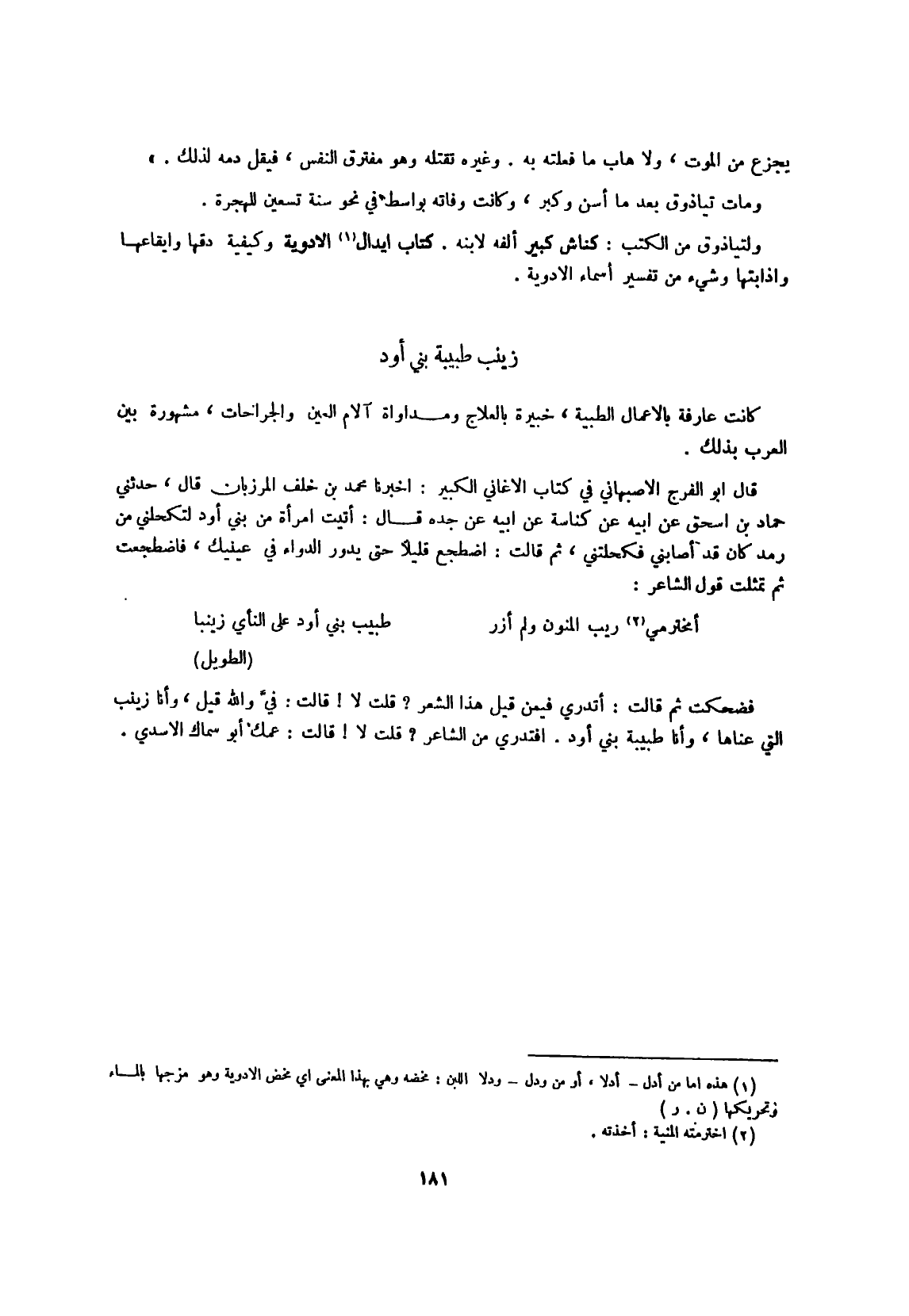 فَضَحكت ثمَّ قَالَت أَتَدْرِي فِيمَن قيل هَذَا الشّعْر قلت لَا قَالَت فِي وَالله قيل وَأَنا زَيْنَب الَّتِي عناها وَأَنا طبيبة بني أود