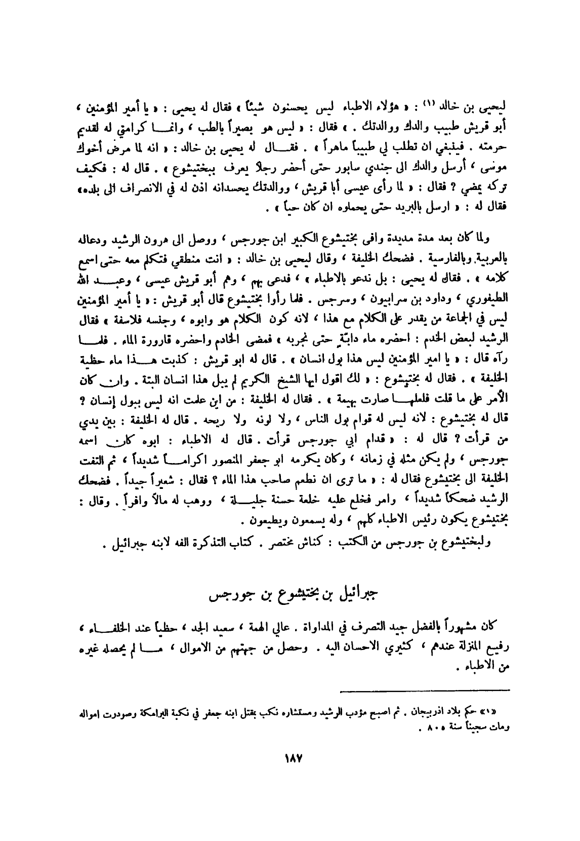 وَلما كَانَ بعد مُدَّة مديدة وافى بختيشوع الْكَبِير ابْن جورجس وَوصل إِلَى هرون الرشيد ودعا لَهُ بِالْعَرَبِيَّةِ وبالفارسية