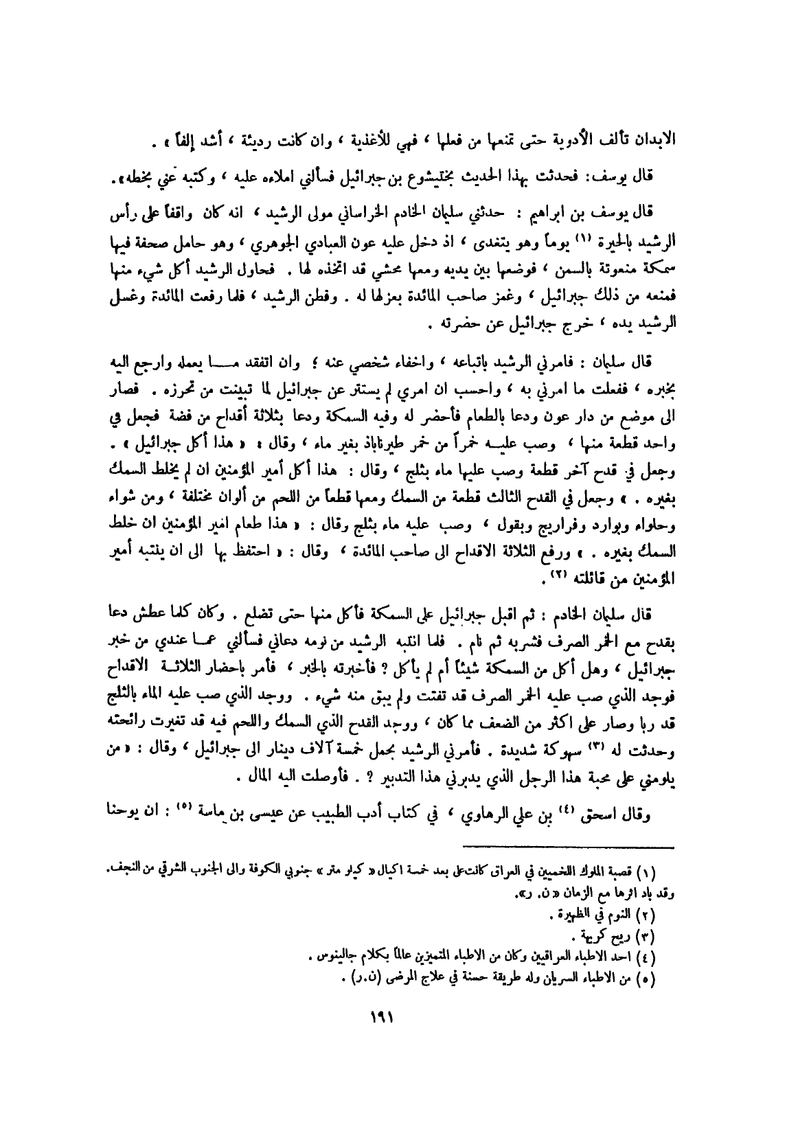فحاول الرشيد أكل شَيْء مِنْهَا فَمَنعه من ذَلِك جِبْرَائِيل وغمز صَاحب الْمَائِدَة بعزلها لَهُ