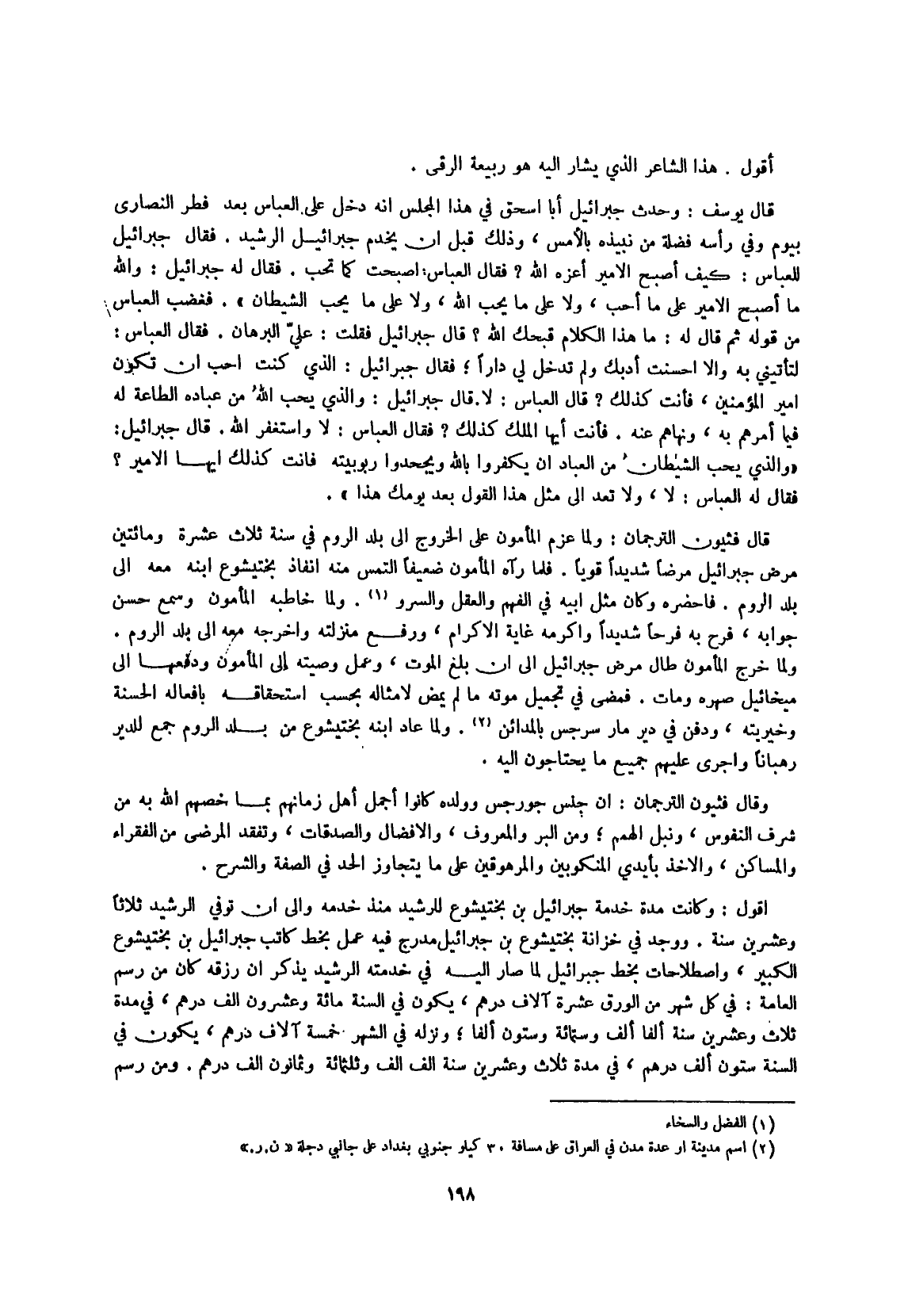 أَقُول وَكَانَت مُدَّة خدمَة جِبْرَائِيل بن بختيشوع للرشيد مُنْذُ خدمه وَإِلَى أَن توفّي الرشيد ثَلَاثًا وَعشْرين سنة