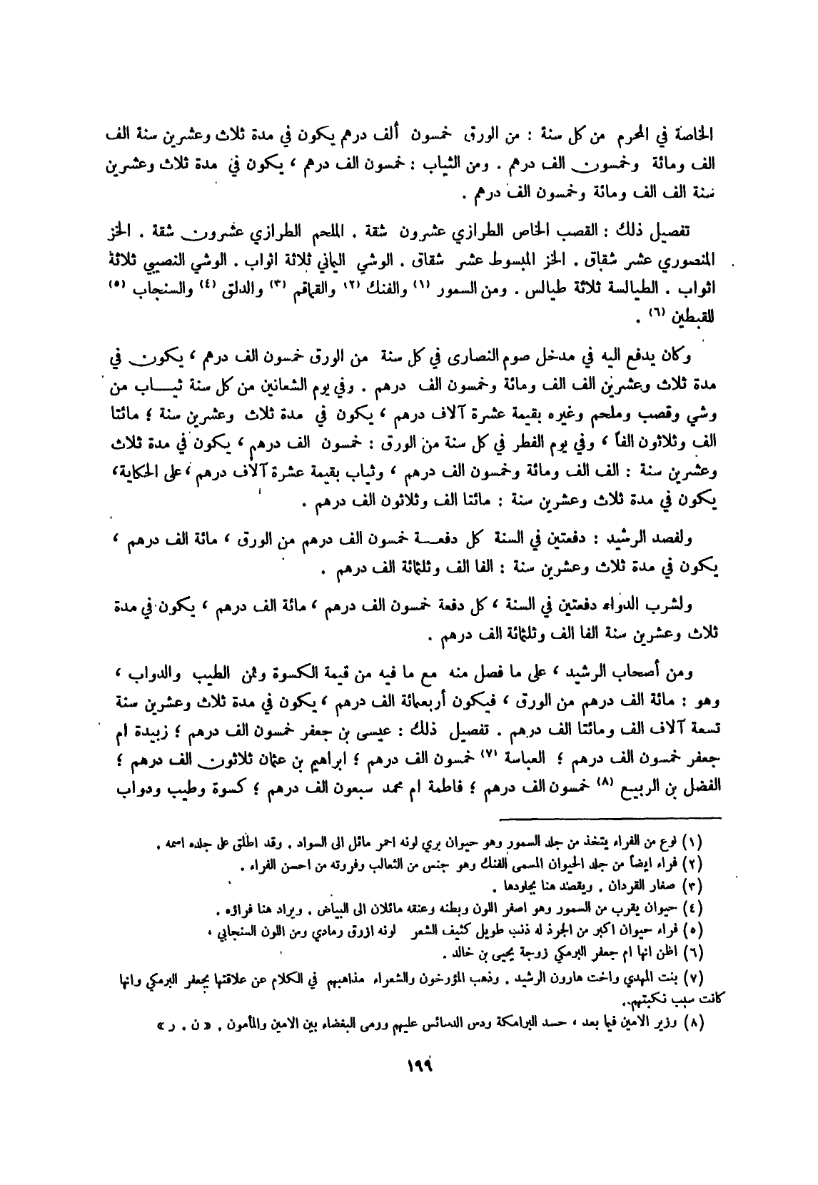 وَمن أَصْحَاب الرشيد على مَا فصل مِنْهُ مَعَ مَا فِيهِ من قيمَة الْكسْوَة وَثمن الطّيب وَالدَّوَاب وَهُوَ مائَة ألف دِرْهَم من الْوَرق فَيكون أَرْبَعمِائَة ألف دِرْهَم يكون فِي مُدَّة ثَلَاث وَعشْرين سنة تِسْعَة آلَاف ألف وَمِائَتَا ألف دِرْهَم