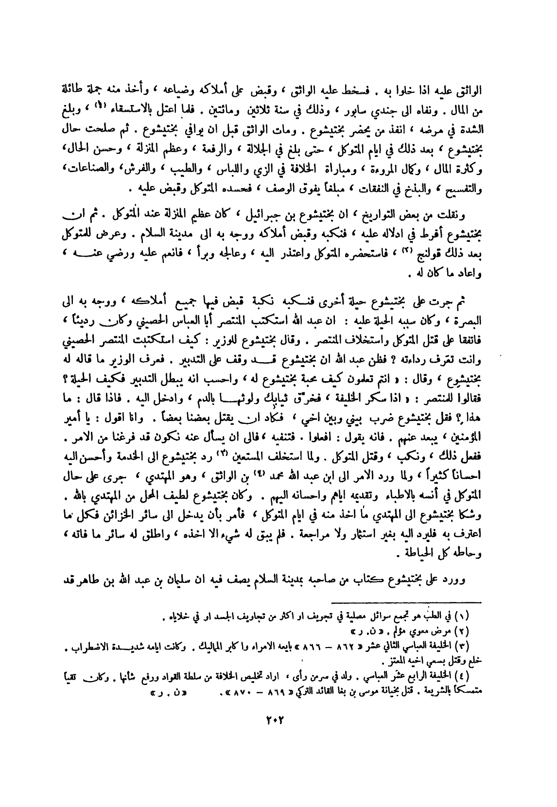 ونقلت من بعض التواريخ أَن بختيشوع بن جِبْرَائِيل كَانَ عَظِيم الْمنزلَة عِنْد المتَوَكل