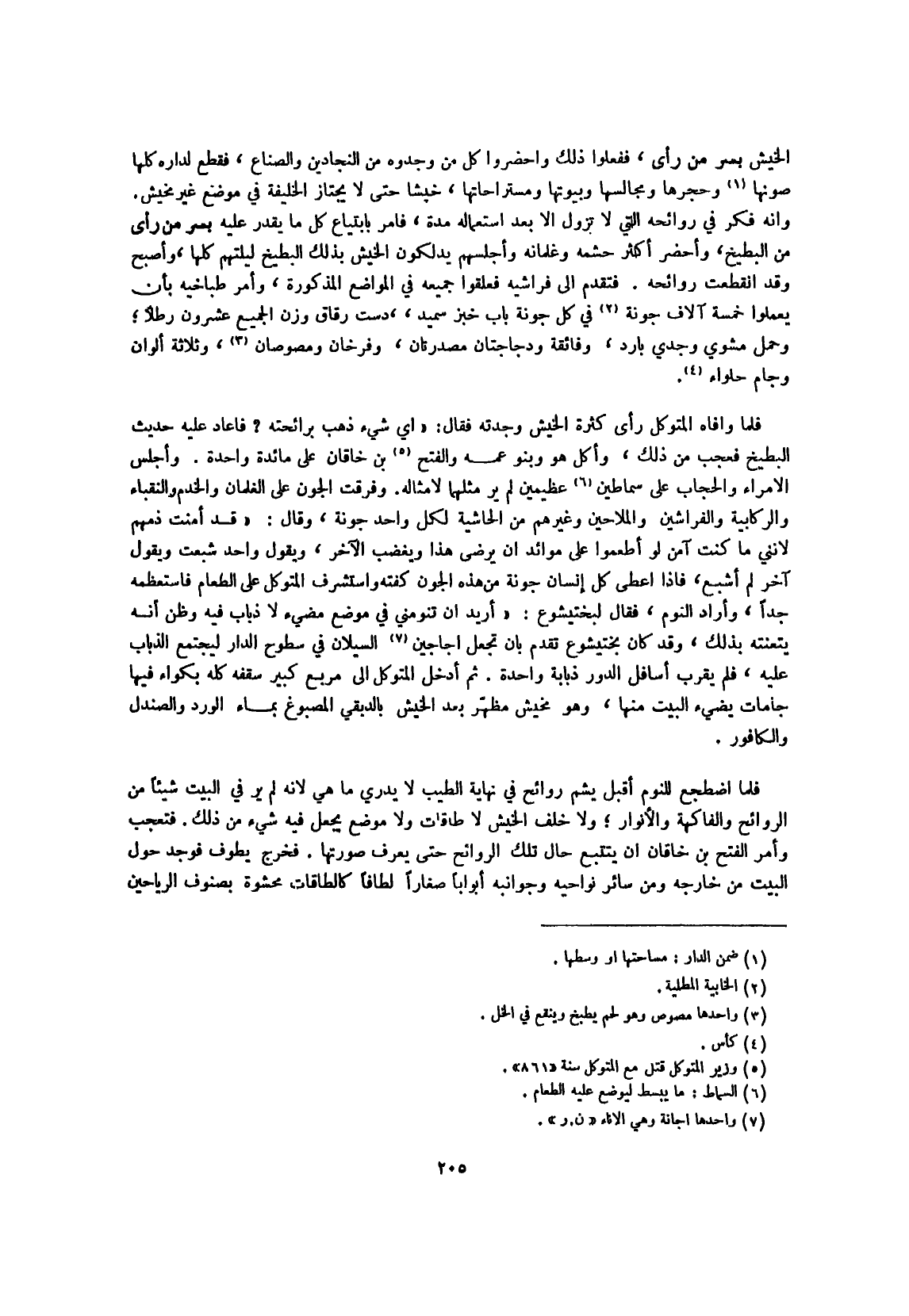 وَفرقت الجون على الغلمان والخدم والنقباء والركابية والفراشين والملاحين وَغَيرهم من الْحَاشِيَة لكل وَاحِد جونة وَقَالَ قد أمنت ذمهم لأنني مَا كنت آمن لَو أطعموا على مَوَائِد أَن يرضى هَذَا ويغضب الآخر وَيَقُول وَاحِد شبعت وَيَقُول آخر لم أشْبع فَإِذا أعْطى كل إِنْسَان جونة من هَذِه الجون كفته واستشرف المتَوَكل على الطَّعَام فاستعظمه جدا وَأَرَادَ النّوم فَقَالَ لبختيشوع أُرِيد أَن تنومني فِي مَوضِع مضيء لَا ذُبَاب فِيهِ وَظن أَنه يتعنته بذلك وَقد كَانَ بختيشوع تقدم بِأَن تجْعَل أجاجين السيلان فِي سطوح الدَّار ليجتمع الذُّبَاب عَلَيْهِ فَلم يقرب أسافل الدّور ذُبَابَة وَاحِدَة