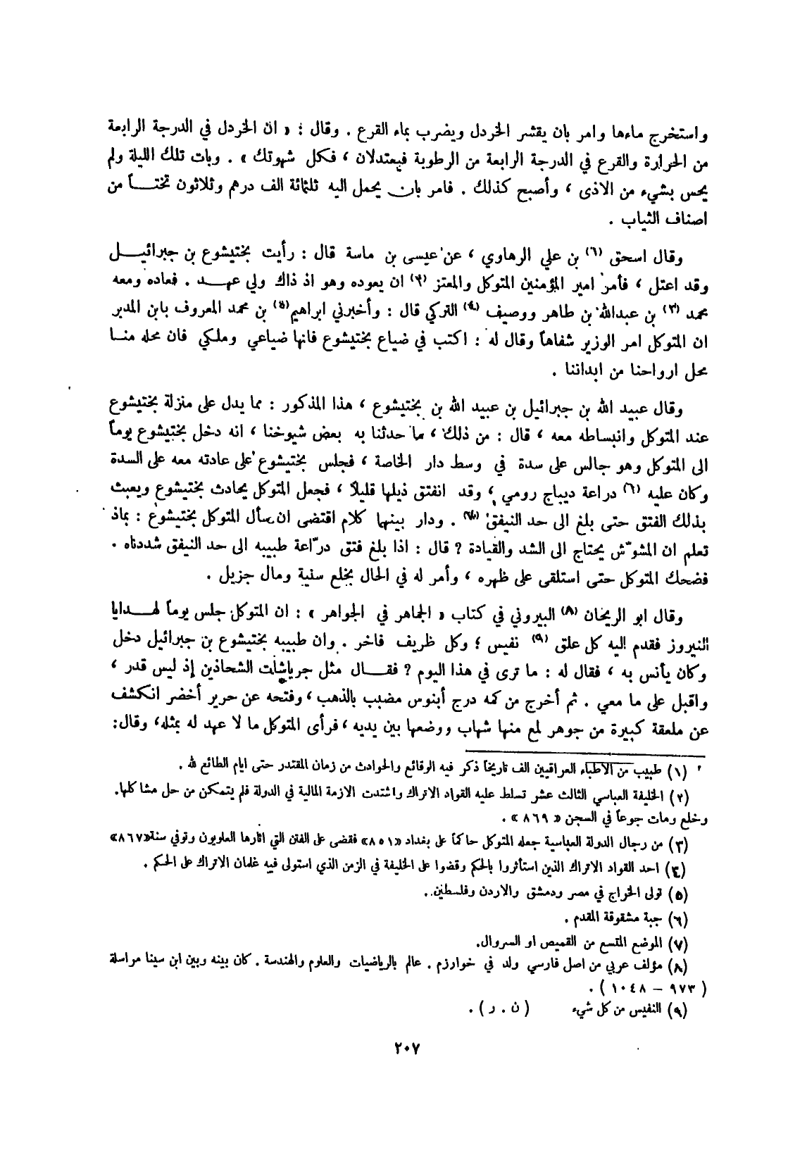 فعاده وَمَعَهُ مُحَمَّد بن عبد الله بن طَاهِر ووصيف التركي قَالَ وَأَخْبرنِي إِبْرَاهِيم بن مُحَمَّد الْمَعْرُوف بِابْن الْمُدبر أَن المتَوَكل أَمر الْوَزير شفاها وَقَالَ لَهُ اكْتُبْ فِي ضيَاع بختيشوع فَإِنَّهَا ضياعي وملكي فَإِن مَحَله منا مَحل أَرْوَاحنَا من أبداننا