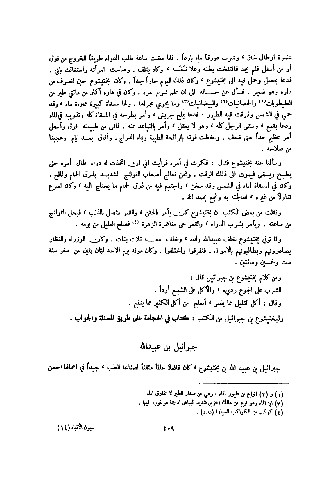 جِبْرَائِيل بن عبيد الله بن بختيشوع كَانَ فَاضلا عَالما متقنا لصناعة الطِّبّ جيدا فِي أَعمالهَا حسن