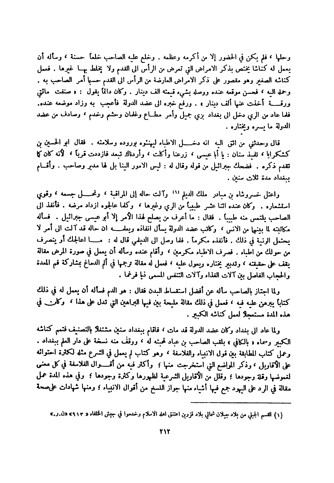 فصرف الْأَطِبَّاء مكرمين وَأقَام عِنْده وَسَأَلَهُ أَن يعْمل فِي صُورَة الْمَرَض مقَالَة يقف على حَقِيقَته وتدبير يختاره ويعول عَلَيْهِ فَعمل لَهُ مقَالَة ترجمها فِي ألم الدِّمَاغ بمشاركة فَم الْمعدة والحجاب الْفَاصِل بَين آلَات الْغذَاء وآلات التنفس الْمُسَمّى ذيا فرغما