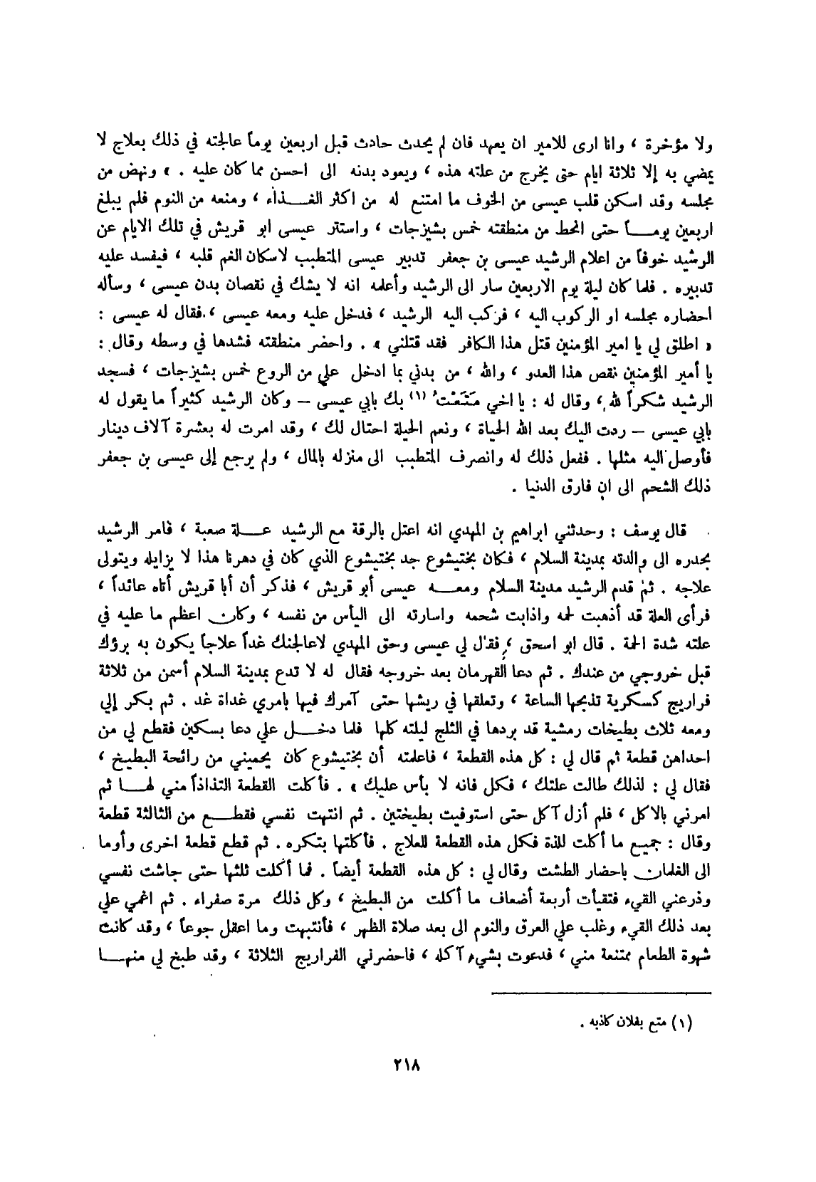 ثمَّ بكر إِلَيّ وَمَعَهُ ثَلَاث بطيخات رمشية قد بردهَا فِي الثَّلج ليلته كلهَا فَلَمَّا دخل عَليّ دَعَا بسكين فَقطع لي من إِحْدَاهُنَّ قِطْعَة ثمَّ قَالَ لي كل هَذِه الْقطعَة فأعلمته أَن بختيشوع كَانَ يحميني من رَائِحَة الْبِطِّيخ فَقَالَ لي لذَلِك طَالَتْ علتك فَكل فَإِنَّهُ لَا بَأْس عَلَيْك