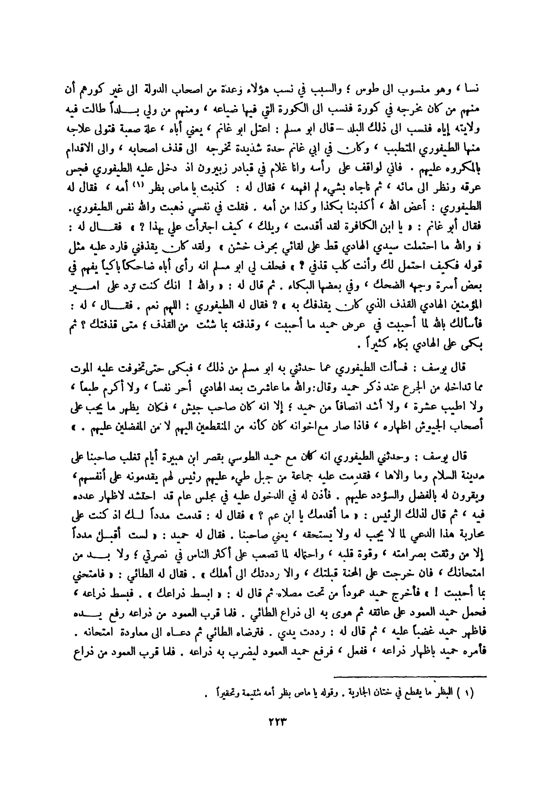 قَالَ يُوسُف وحَدثني الطيفوري أَنه كَانَ مَعَ حميد الطوسي بقصر ابْن هُبَيْرَة أَيَّام تغلب صاحبنا على مَدِينَة السَّلَام وَمَا والاها فَقدمت عَلَيْهِ جمَاعَة من جبل طَيء عَلَيْهِم رَئِيس لَهُم يقدمونه على أنفسهم ويقرون لَهُ بِالْفَضْلِ والسؤدد عَلَيْهِم
