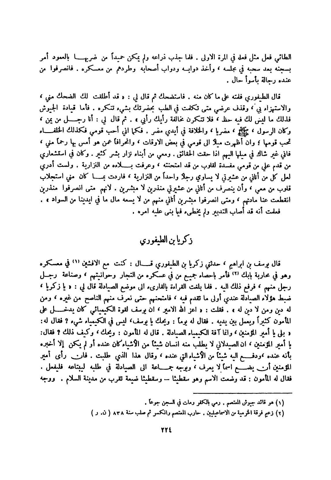 قَالَ يُوسُف بن إِبْرَاهِيم حَدثنِي زَكَرِيَّا بن الطيفوري قَالَ كنت مَعَ الأفشين فِي مُعَسْكَره وَهُوَ فِي محاربة بابك فَأمر بإحصاء جَمِيع من فِي عسكره من التُّجَّار وحوانيتهم وصناعة رجل رجل مِنْهُم فَرفع ذَلِك إِلَيْهِ