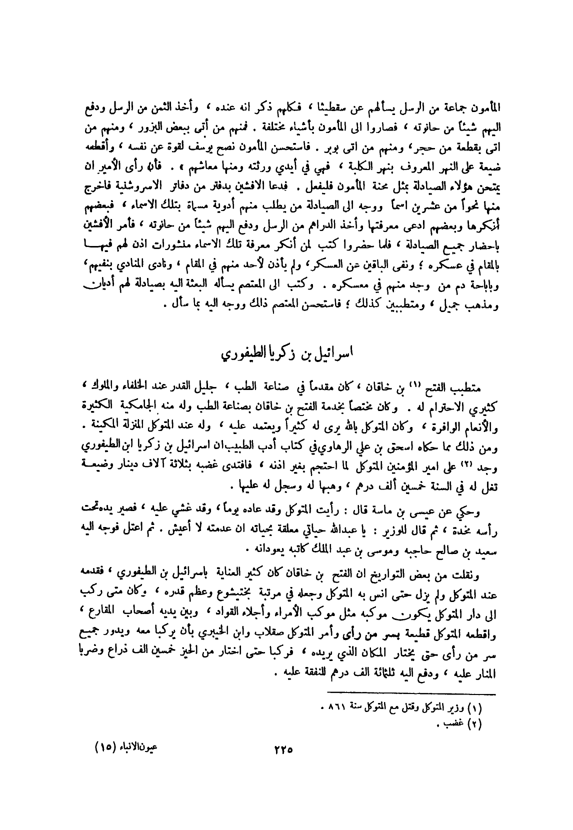 وَمن ذَلِك مِمَّا حَكَاهُ إِسْحَق بن عَليّ الرهاوي فِي كتاب أدب الطَّبِيب أَن إِسْرَائِيل بن زَكَرِيَّا ابْن الطيفوري وجد على أَمِير الْمُؤمنِينَ المتَوَكل لما احْتجم بِغَيْر إِذْنه فَافْتدى غَضَبه بِثَلَاثَة آلَاف دِينَار وضيعة تغل لَهُ فِي السّنة خمسين ألف دِرْهَم وَهبهَا لَهُ وسجل لَهُ عَلَيْهَا