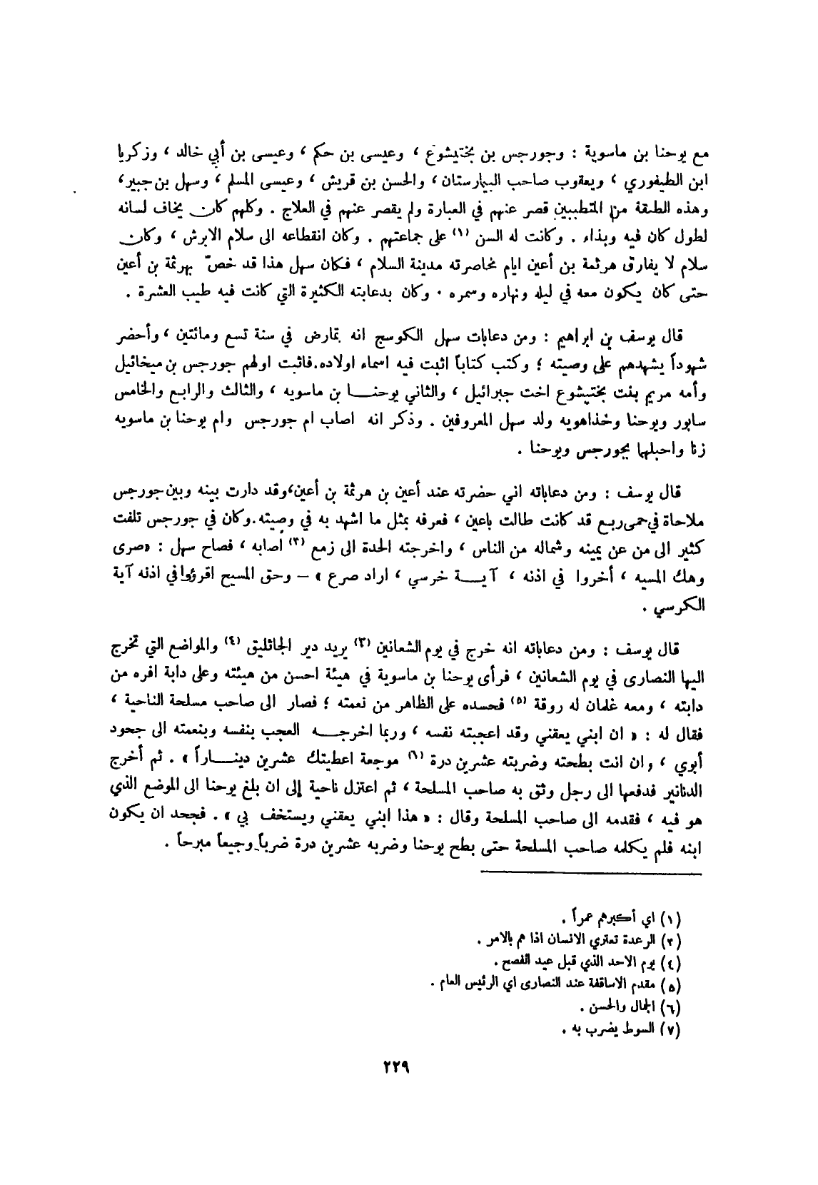 فَأثْبت أَوَّلهمْ جورجس بن ميخائيل وَأمه مَرْيَم بنت بختيشوع أُخْت جِبْرَائِيل وَالثَّانِي يوحنا بن ماسويه وَالثَّالِث وَالرَّابِع وَالْخَامِس سَابُور ويوحنا وخذاهويه ولد سهل المعروفين