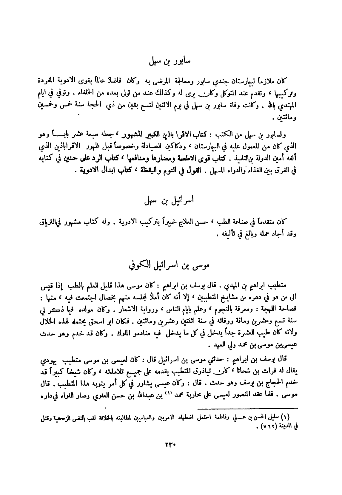 ولسابور بن سهل من الْكتب كتاب الأقراباذين الْكَبِير الْمَشْهُور جعله سَبْعَة عشر بَابا وَهُوَ الَّذِي كَانَ من الْمَعْمُول عَلَيْهِ فِي البيمارستان ودكاكين الصيادلة وخصوصا قبل ظُهُور الأقراباذين الَّذِي أَلفه أَمِين الدولة بن التلميذ