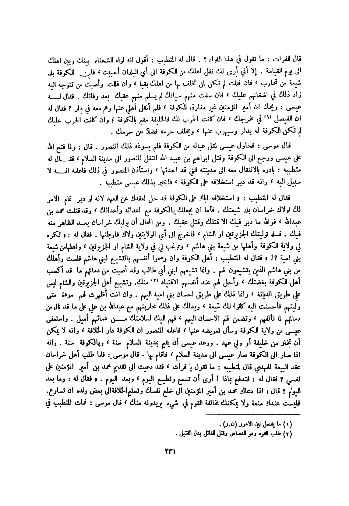 فَقَالَ لَهُ عِيسَى وَيحك إِن أَمِير الْمُؤمنِينَ غير مفارق للكوفة فَلم أنقل أَهلِي عَنْهَا وهم مَعَه فِي دَار فَقَالَ لَهُ أَن الفيصل فِي مخرجك فَإِن كَانَت الْحَرْب لَك فالخليفة مُقيم بِالْكُوفَةِ وَإِن كَانَت الْحَرْب عَلَيْك لم تكن الْكُوفَة لَهُ بدار وسيهرب عَنْهَا ويخلف حرمه فضلا عَن حَرمك