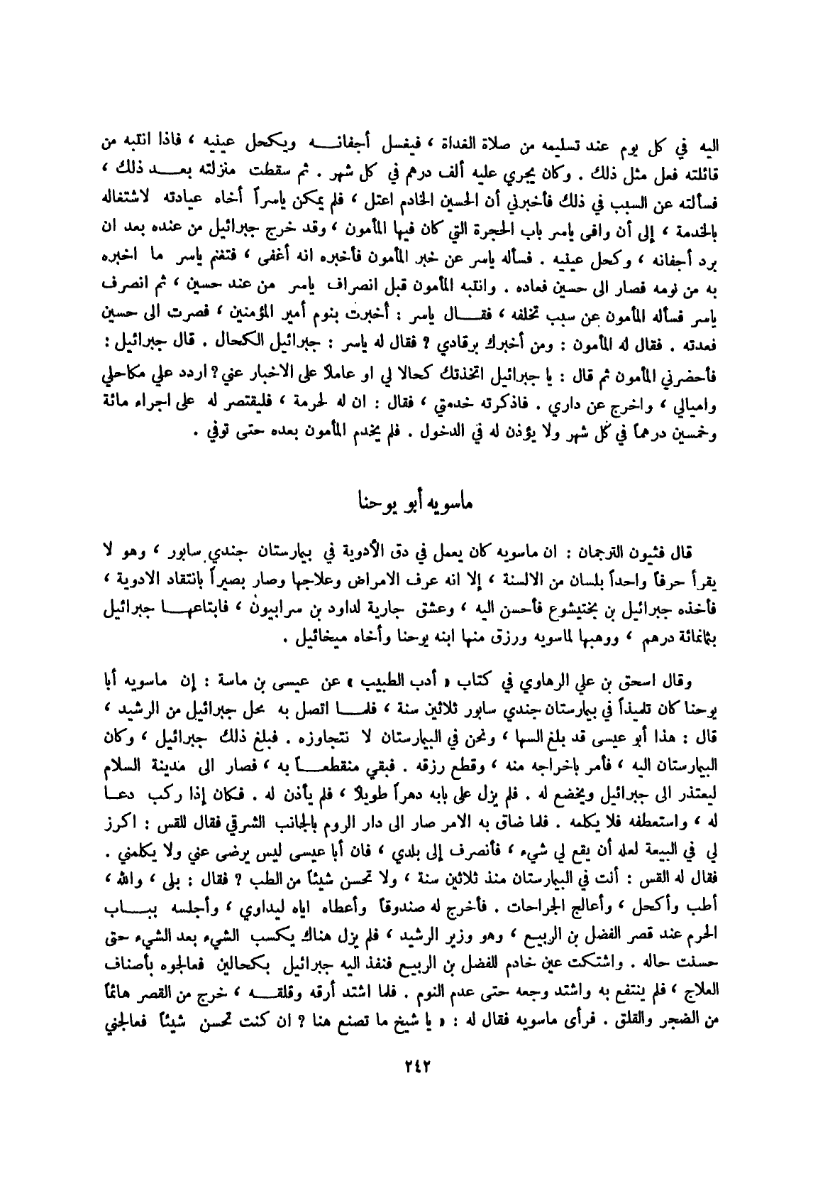 قَالَ فثيون الترجمان أَن ماسويه كَانَ يعْمل فِي دق الْأَدْوِيَة فِي بيمارستان جندي سَابُور وَهُوَ لَا يقْرَأ حرفا وَاحِدًا بِلِسَان من الْأَلْسِنَة إِلَّا أَنه عرف الْأَمْرَاض وعلاجها وَصَارَ بَصيرًا بانتقاد الْأَدْوِيَة فَأَخذه جِبْرَائِيل بن بختيشوع فَأحْسن إِلَيْهِ وعشق جَارِيَة لداود بن سرابيون فابتاعها جِبْرَائِيل بثمانمائة دِرْهَم ووهبها لماسويه ورزق مِنْهَا ابْنه يوحنا وأخاه ميخائيل