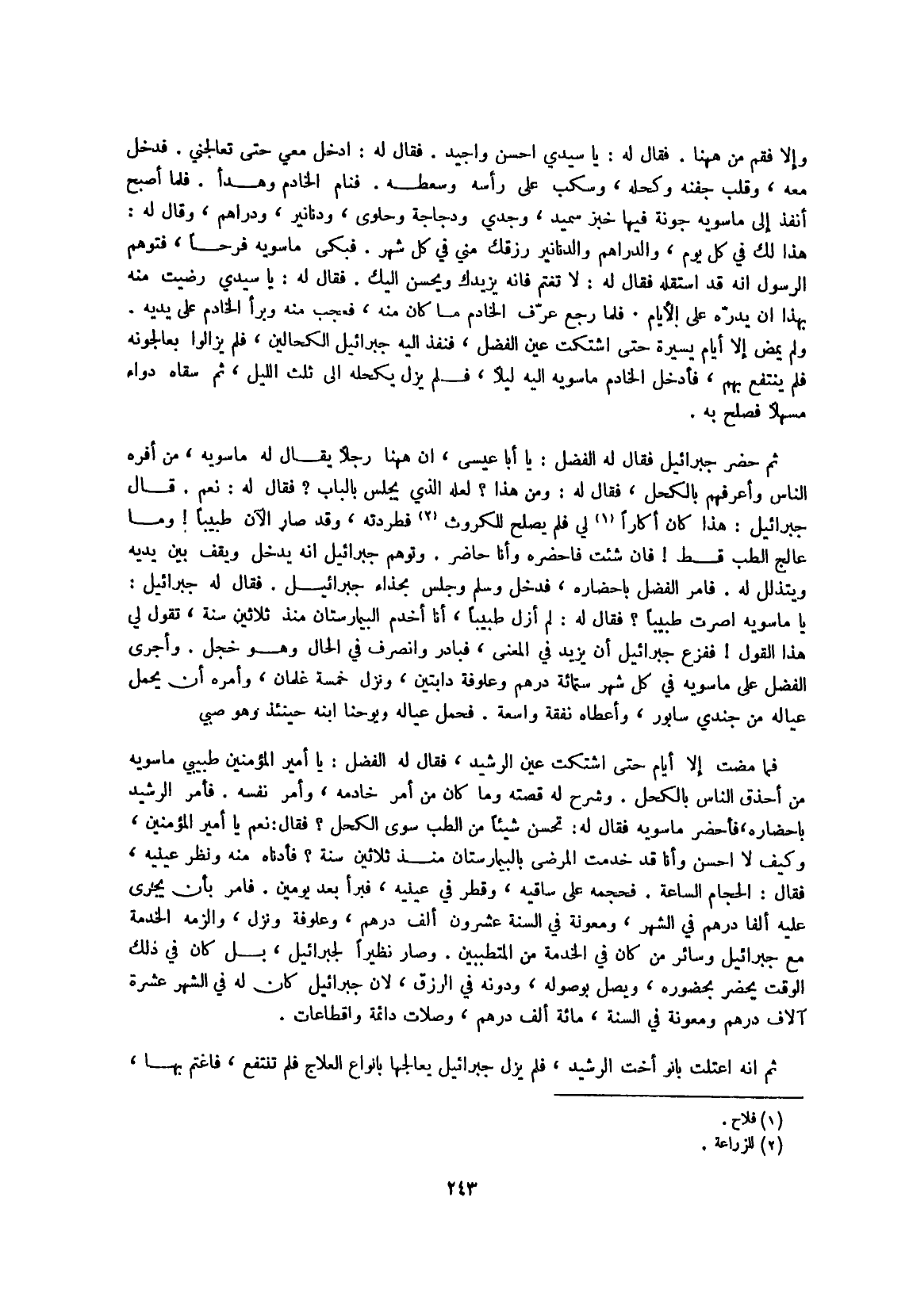 وَلم يمض إِلَّا أَيَّام يسرة حَتَّى اشتكت عين الْفضل فنفذ إِلَيْهِ جِبْرَائِيل الكحالين فَلم يزَالُوا يعالجونه فَلم ينْتَفع بهم فَأدْخل الْخَادِم ماسويه إِلَيْهِ لَيْلًا فَلم يزل يكحله إِلَى ثلث اللَّيْل ثمَّ سقَاهُ دَوَاء مسهلا فصلح بِهِ