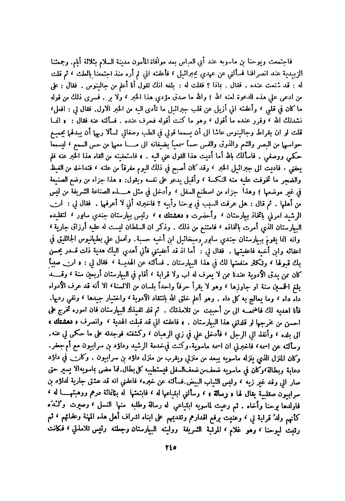 ثمَّ رعيت لماسويه ابتياعي لَهُ رِسَالَة وَطَلَبه مِنْهَا النَّسْل وصيرت وَلَده كَأَنَّهُمْ ولد قرَابَة لي وعنيت بِرَفْع أقدارهم وتقديمهم على أَبنَاء أَشْرَاف أهل هَذِه المهنة وعلمائهم ثمَّ رتبت ليوحنا وَهُوَ غُلَام الْمرتبَة الشَّرِيفَة ووليته البيمارستان وَجَعَلته رَئِيس تلامذتي فَكَانَت
