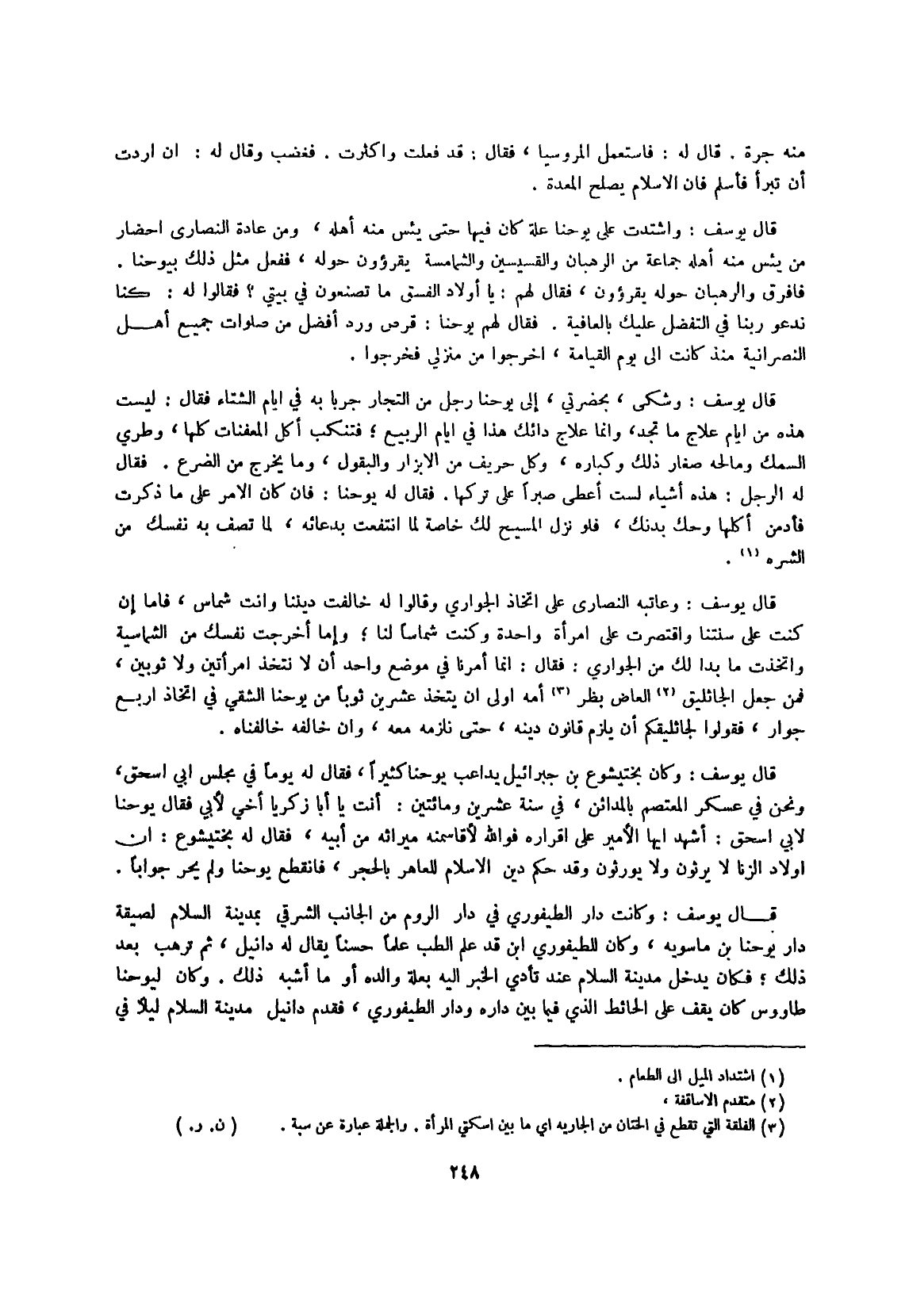 قَالَ يُوسُف وعاتبه النَّصَارَى على اتِّخَاذ الْجَوَارِي وَقَالُوا لَهُ خَالَفت ديننَا وَأَنت شماس فَأَما إِن كنت على سنتنا واقتصرت على امْرَأَة وَاحِدَة وَكنت شماسا لنا وَإِمَّا أخرجت نَفسك من الشماسية واتخذت مَا بدا لَك من الْجَوَارِي فَقَالَ إِنَّمَا أمرنَا فِي مَوضِع وَاحِد أَن لَا نتَّخذ امْرَأتَيْنِ وَلَا ثَوْبَيْنِ فَمن جعل الجاثليق العاض بظر أمه أولى أَن يتَّخذ عشْرين ثوبا من يوحنا الشقي فِي اتِّخَاذ أَربع جوَار فَقولُوا لجاثليقكم أَن يلْزم قانون دينه حَتَّى نلزمه مَعَه وَإِن خَالفه خالفناه