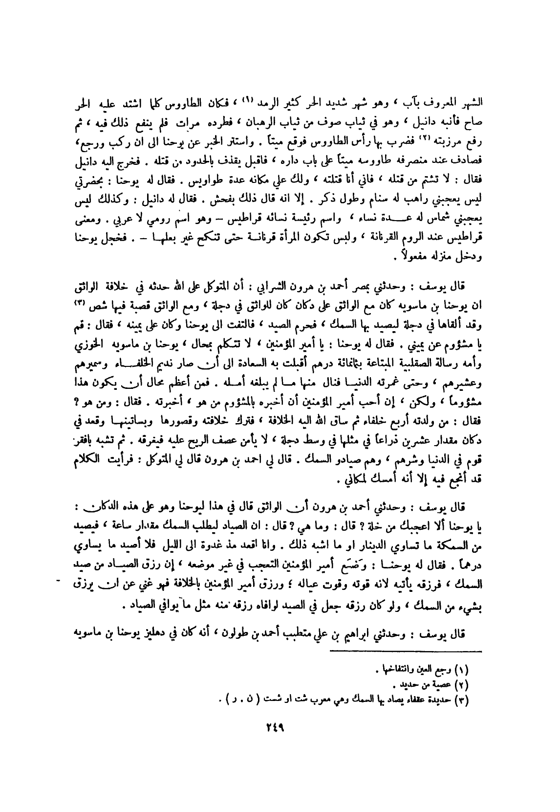 فَقَالَ لَهُ يوحنا يَا أَمِير الْمُؤمنِينَ لَا تَتَكَلَّم بمحال يوحنا بن ماسويه الخوزي وَأمه رِسَالَة الصقلبية المبتاعة بثمانمائة دِرْهَم أَقبلت بِهِ السَّعَادَة إِلَى أَن صَار نديم الْخُلَفَاء وسميرهم وعشيرهم وَحَتَّى غمرته الدُّنْيَا فنال مِنْهَا مَا لم يبلغهُ أمله