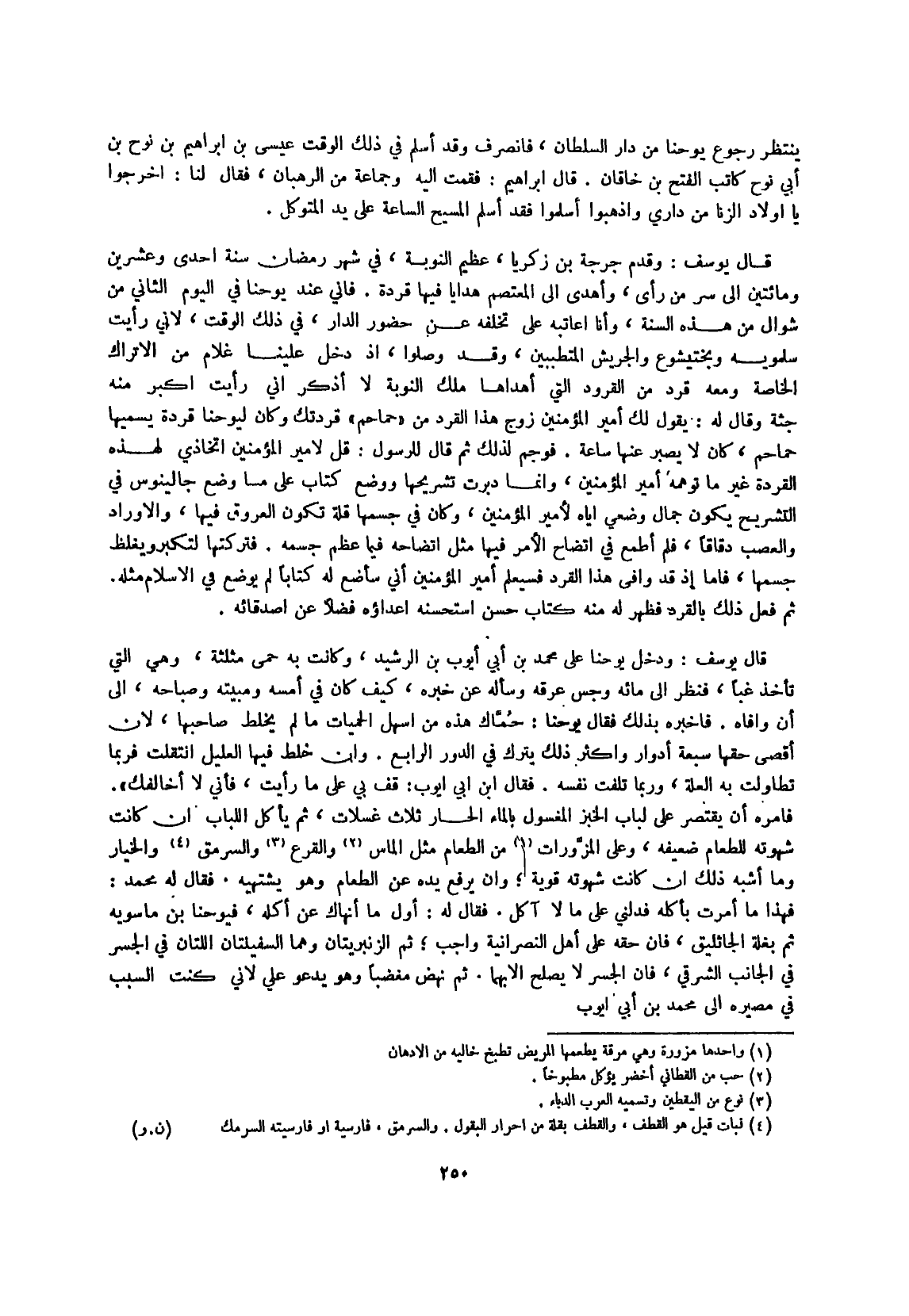 فَإِنِّي عِنْد يوحنا فِي الْيَوْم الثَّانِي من شَوَّال من هَذِه السّنة وَأَنا أعاتبه على تخلفه عَن حُضُور الدَّار فِي ذَلِك الْوَقْت لِأَنِّي رَأَيْت سلمويه وبختيشوع والجريش المتطببين وَقد وصلوا إِذْ دخل علينا غُلَام من الأتراك الْخَاصَّة وَمَعَهُ قرد من القرود الَّتِي أهداها ملك النّوبَة لَا أذكر إِنِّي رَأَيْت أكبر مِنْهُ جثة وَقَالَ لَهُ يَقُول لَك أَمِير الْمُؤمنِينَ زوج هَذَا القرد من حماحم قردتك وَكَانَ ليوحنا قردة يسميها حماحم كَانَ لَا يصبر عَنْهَا سَاعَة
