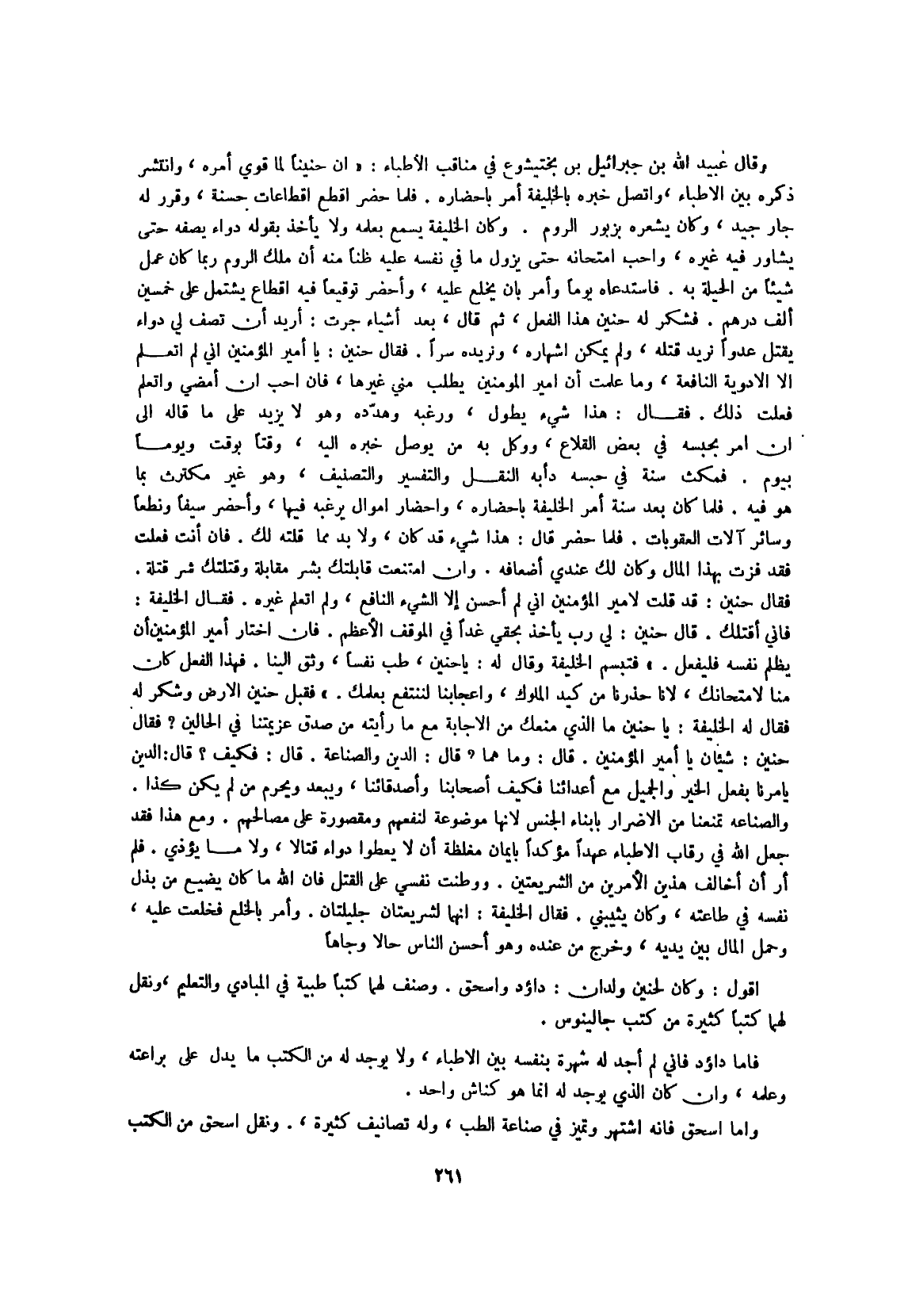 وَقَالَ عبيد الله بن جِبْرَائِيل بن بختيشوع فِي مَنَاقِب الْأَطِبَّاء أَن حنينا لما قوي أمره وانتشر ذكره بَين الْأَطِبَّاء واتصل خَبره بالخليفة أَمر بإحضاره