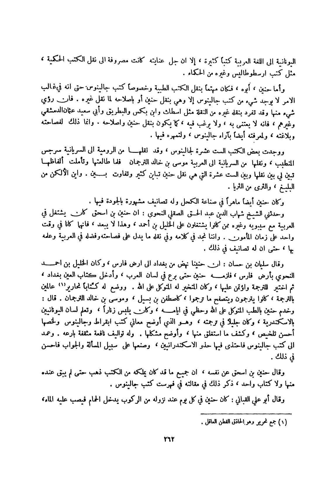 فَإِن رُؤِيَ شَيْء مِنْهَا وَقد تفرد بنقله غَيره من النقلَة مثل أسطاث وَابْن بكس والبطريق وَأبي سعيد عُثْمَان الدِّمَشْقِي وَغَيرهم فَإِنَّهُ لَا يعتنى بِهِ وَلَا يرغب فِيهِ كَمَا يكون بِنَقْل حنين وإصلاحه