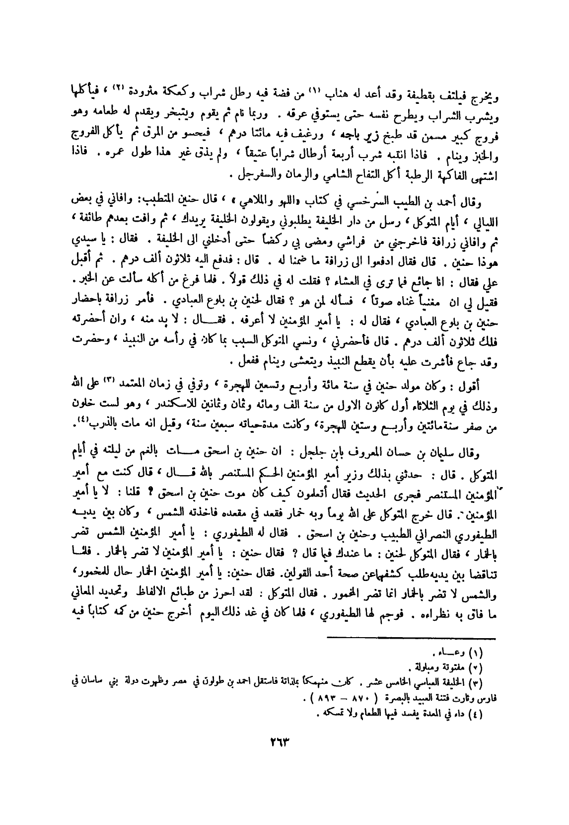 وَقَالَ أَحْمد بن الطّيب السَّرخسِيّ فِي كتاب اللَّهْو والملاهي قَالَ حنين المتطبب وافاني فِي بعض اللَّيَالِي أَيَّام المتَوَكل رسل من دَار الْخَلِيفَة يطلبوني وَيَقُولُونَ الْخَلِيفَة يُرِيدُكَ ثمَّ وافت بعدهمْ طَائِفَة ثمَّ وافاني زرافة فَأَخْرجنِي من فِرَاشِي وَمضى بِي ركضا حَتَّى أدخلني إِلَى الْخَلِيفَة